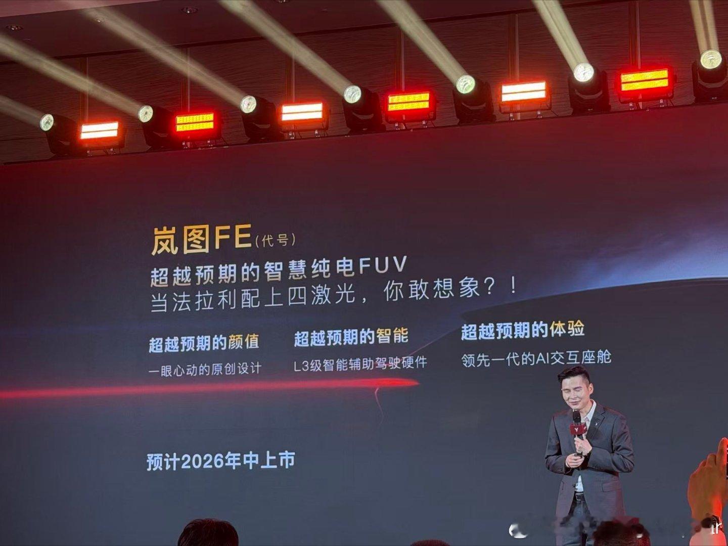 其次就是岚图FE,定位纯电FUV,甚至配上4个激光雷达。有意思的是,他们用法拉利类比,可想而知性能实力会有多强。