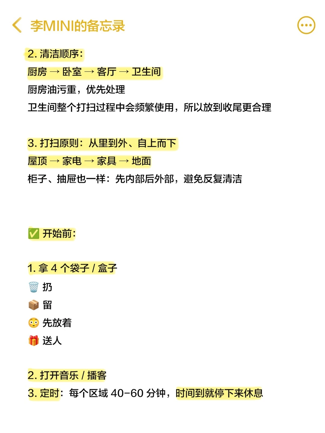 2. 清洁顺序:厨房 → 卧室 → 客厅 → 卫生间