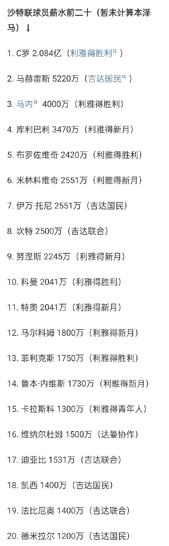 沙特联年薪排行榜:C罗超2亿欧遥遥领先,马赫雷斯5220万第2,马内4000万第3,库利巴利 3470万第4,坎特 2500万第8 02月03日 据统计,C罗年薪超2亿欧领跑,马赫雷斯5220万欧第2,马内4000万第3,库利巴利 3470万第4,布罗佐维奇 2420万第5,米林科维奇 2551万第6,伊万·托尼 2551万第7,坎特 2500万第8! 刚加盟利雅得新月的本泽马半年的薪水为2500万欧,若续约下赛季薪水将可能达到5000万欧年薪可以排在第3位