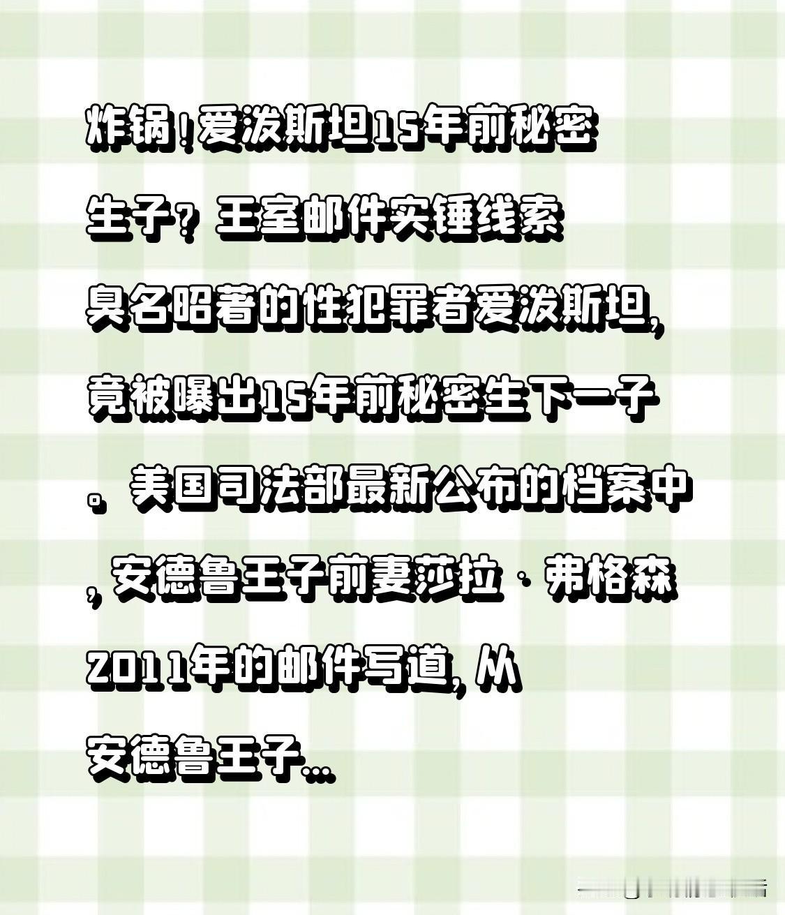 炸锅!爱泼斯坦15年前秘密生子?王室邮件成实锤线索 臭名昭著的性犯罪者爱泼斯坦,被曝出15年前秘密育有一子。美国司法部新公布档案中,安德鲁王子前妻莎拉·弗格森2011年邮件称,从王子处听闻爱泼斯坦得子。 爱泼斯坦生前无公开子女,2019年狱中死后,130多人自称私生子女却无法证实。此次官方邮件首提书面线索,消息源指向安德鲁王子,莎拉未回应,孩子信息难考。 想直观梳理爱泼斯坦事件时间点,要我整理清单吗? 爱泼斯坦性侵案 爱泼斯坦名单门 爱泼斯坦纪录片 爱泼斯坦䅁