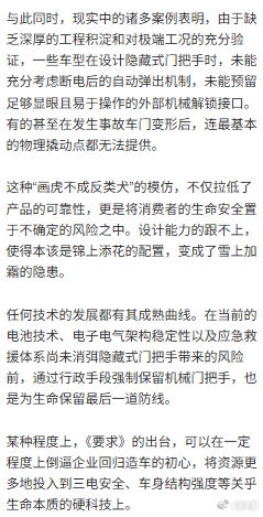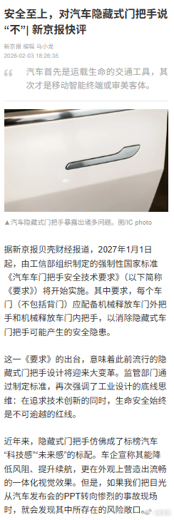 【安全至上对汽车隐藏式门把手说不 | 新京报快评】车门把手核心功能必须是确定的开门在车辆发生严重碰撞导致全车断电起火的危急关头,外部救援人员面对光秃秃的车门无从下手,车内人员因机械解锁机构复杂难寻而错失逃生良机。为了那微乎其微的风阻系数优化和潮流追赶,却让宝贵的生命困在“打不开的车门”前,这无疑是本末倒置。