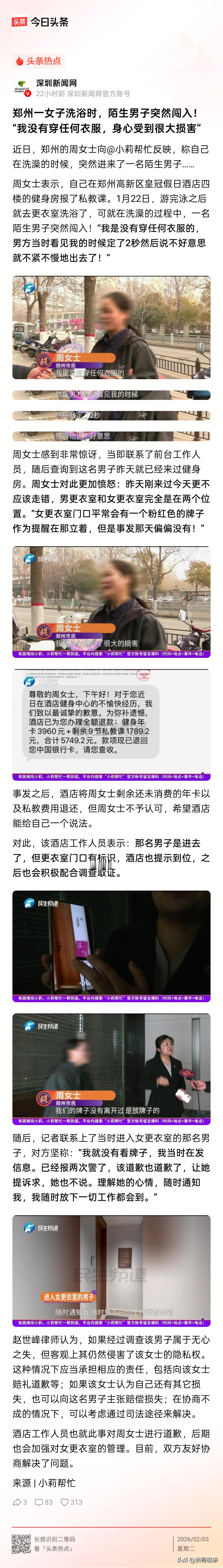 “被看光了!”河南郑州,女子在健身房洗澡时,一陌生男子突然闯入其中,待了2秒后才出去。事后,女子又羞又恼,觉得自己的隐私被对方看了个精光,要求健身房给说法。对此,健身房一方为表歉意,便退还了女子5700余元的健身费。而误闯的男子也表示,事发当时他在看手机,是不小心误入的,已向女子表达了歉意,但她依然不满意,已报了2次警。 事情是这样的,周女士为保持好身材,在当地一家健身房办了年卡加私教课,平时健完身后再在里面洗个澡,别提有多舒服惬意。 事发当天,周女士游完泳后,进入女更衣室洗浴,她正毫无防备冲洗时,一名陌生男子突然闯了进来! 此时,她一丝不挂,看见对方进来,整个人瞬间懵了。 而这名男子,看见她也愣了两秒,然后说了句“不好意思”,便不紧不慢地出去了。 周女士又羞又气,赶紧联系前台。 她本以为对方是第一次来走错了地方,可一查才知道,该男子前一天刚来过,根本不是生客! 而且男女更衣室位置完全不同,怎么可能认错呢? 更让周女士想不通的是,女更衣室门口平时立着的粉红色提醒牌,事发当天却偏偏不见了。这到底是健身房无心之失,还是故意为之呢? 事后,健身房反应倒也爽快,直接退了周女士未消费的5749元年卡和私教费。 可周女士压根不满意,她认为就不是钱的事儿,因为此事,周女士受了很大的委屈,心理也承受着巨大的压力,但依然没得到健身房的一个合理说法。 对此,健身房则声称,更衣室有标识且已尽到了提醒责任,后续会配合调查。 事后,周女士找来记者,记者联系上闯入男子,男子表示事发当时,他在发信息没看牌子,误闯绝对是无心之举。 而就此事,周女士也已报警两次,男子也道过歉,男子让周女士提诉求却没得到回应,他表示自己随时愿意配合处理。 其实,从整个事情来看,这事可大可小。 往小了说,这只是男子一次“无心之失”的闯入,男子道了歉,健身房退了钱,按道理来讲,各方都有了交代。 但对于周女士来说,这事显然小不了。她正常洗澡,却遭陌生男子闯入,隐私瞬间荡然无存,心理也遭受严重的伤害。显然,这不是靠退钱和道歉能轻易了事的。 《民法典》第1198条规定,体育场馆等经营场所的经营者,对消费者负有安全保障义务,未尽到义务造成他人损害的,要承担侵权责任。 女更衣室是绝对私密空间,健身房不仅要设明显标识,还得确保标识一直有效。 事发当天,提醒牌却不见了,这也说明健身房管理本身就有漏洞,没有尽到相应的义务,对周女士隐私遭到侵犯的结果应承担侵权责任。 而对于误闯入男子,就算真的“无心”,难道就不用担责了吗? 答案是否定的,《民法典》第991条和第1032条都明确规定,自然人的隐私权受法律严格保护,任何组织或个人都不能侵扰他人私密空间、侵害他人隐私权 。 洗澡时的更衣室属于典型私密空间,男子擅自闯入导致周女士隐私暴露,已经构成了隐私权侵权。 男子要承担侵权后果。而道歉只是基本操作,要是给周女士造成心理困扰、精神压力,男子还要承担精神赔偿等。 有网友表示:“这就是一个生活中的小误会,说开了就行了,况且男子也不是故意的。得饶人处且饶人!” 当然,对于周女士如何选择处理此事,我们不予置评。 但这件事也提醒大家,不管在什么场合,他人的隐私和空间依法要受到法律保护,大家千万别因自己的一时疏忽给别人造成困扰,同时还给自己带来麻烦。 对此,你怎么看呢?欢迎大家在评论区留言。
