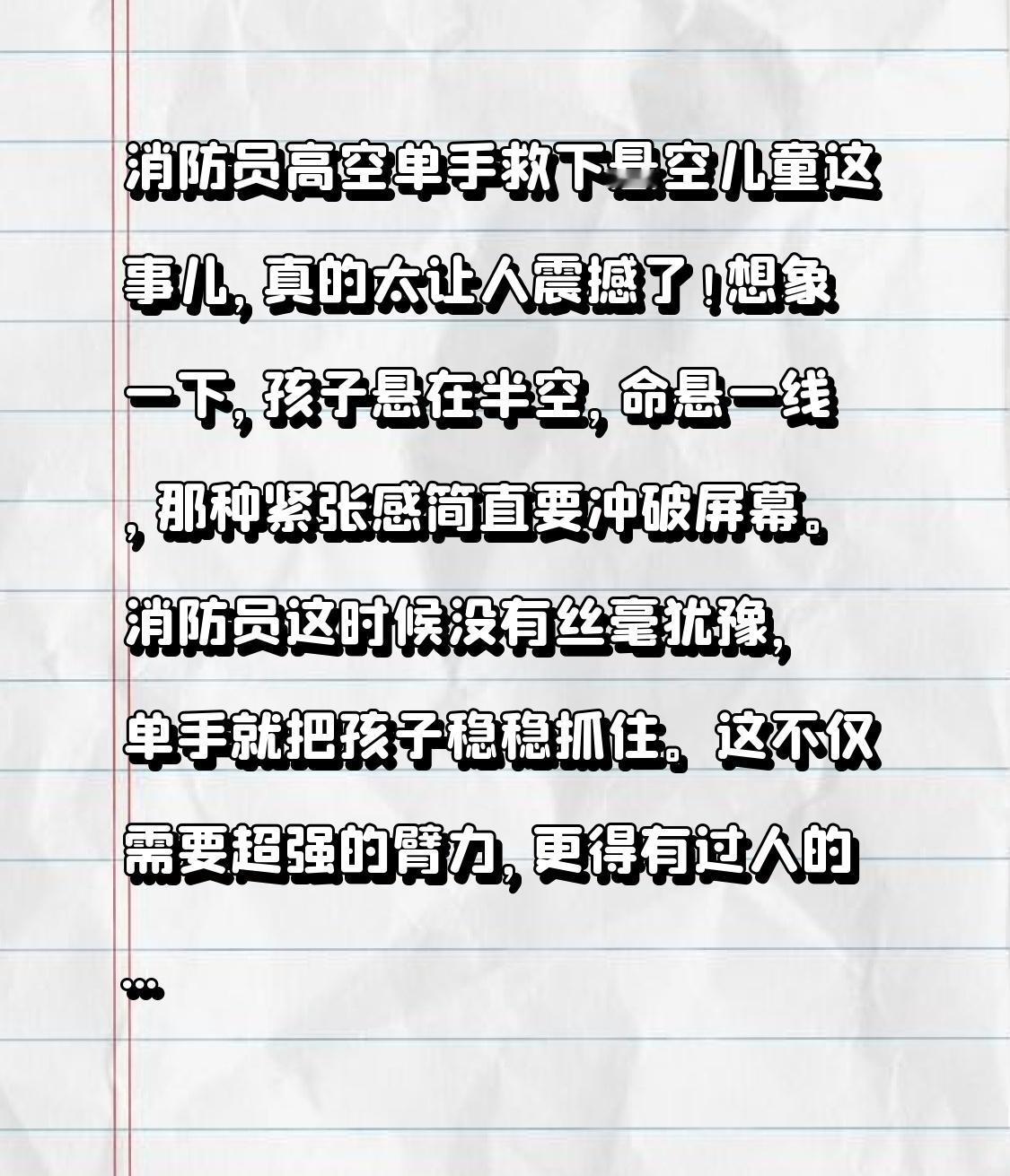 消防员高空单手救下悬空儿童这事儿,真的太让人震撼了!想象一下,孩子悬在半空,命悬一线,那种紧张感简直要冲破屏幕。消防员这时候没有丝毫犹豫,单手就把孩子稳稳抓住。这不仅需要超强的臂力,更得有过人的胆量和冷静。 之前也有类似的新闻,消防员在各种危险场景下逆行救援。他们就像超级英雄,在关键时刻挺身而出。这一抓,抓住的不仅仅是一个孩子,更是一个家庭的希望。为勇敢的消防员点赞,他们是真正的城市守护者! 萌娃救人事迹