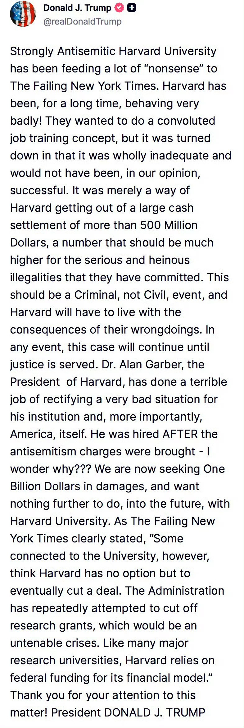 特朗普连续发两文,抨击哈佛大学,指责其长期存在反犹问题、涉嫌严重违法行为,向哈佛大学寻求10亿美元的赔偿,并在未来与其断绝一切关系。并直指《纽约时报》相关报道“完全失实”,要求其立即更正。