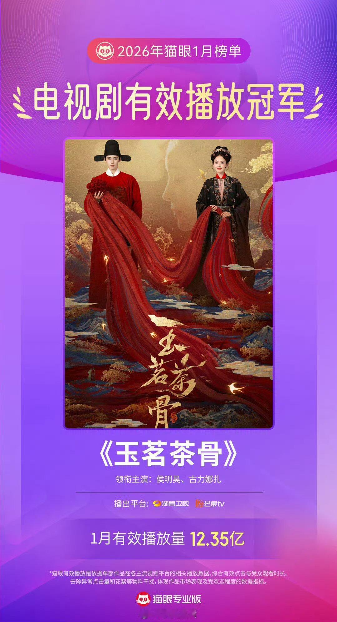 猫眼认证,侯明昊、古力娜扎玉茗茶骨成为1月有效播放量、集均有效播放量双榜冠军!
