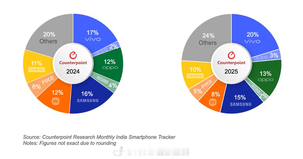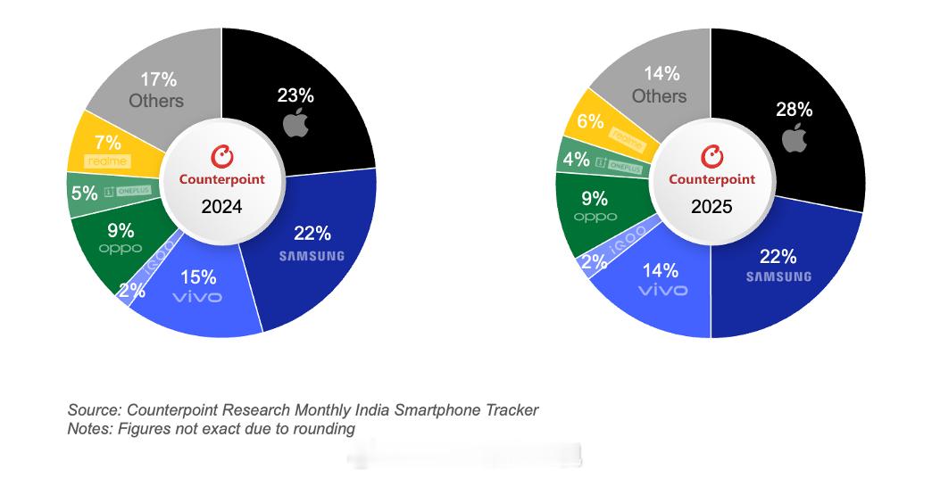 · 凭借稳健的渠道策略与以影像为核心的产品定位,vivo(不含 iQOO 子品牌)以 20% 的出货量份额,稳居 2025年印度智能手机市场出货量榜首。