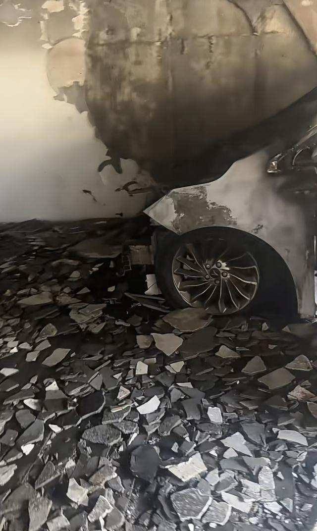 事后,有市民看到,起火车辆的车头烧毁,车辆侧边安全气囊弹出,地库入口处散落着碎石,现场一片狼藉。