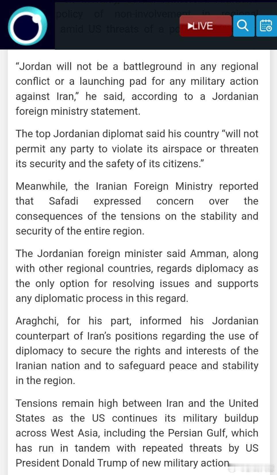 约旦外交大臣艾曼·萨法迪向伊朗保证,约旦不会允许其领土或领空被用于对伊朗伊斯兰共和国发动军事打击。