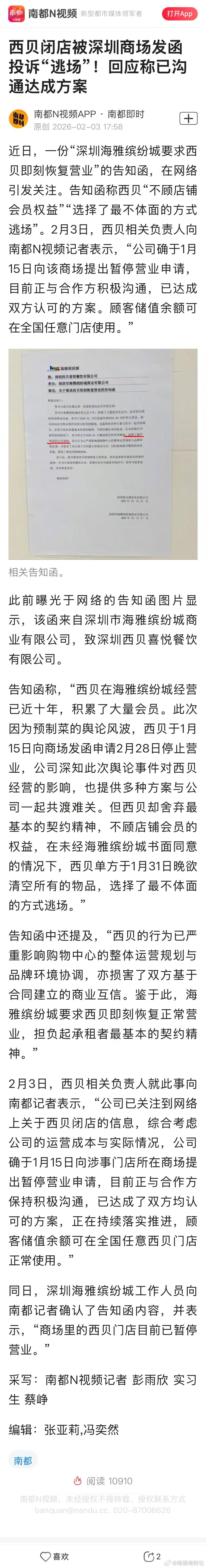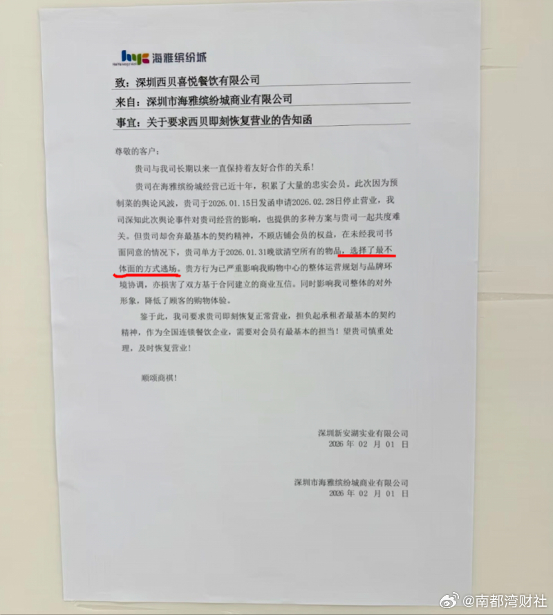 #西贝被指以最不体面方式逃场#【深圳知名商场发文:西贝选择最不体面方式逃场,要求即刻恢复营业……双方回应】#深圳商场发函指责西贝逃场#近日,一份“深圳海雅缤纷城要求西贝即刻恢复营业”的告知函,在网络引发关注。告知函称西贝“不顾店铺会员权益”“选择了最不体面的方式逃场”。今天(2月3日),西贝相关负责人向南都N视频记者表示,“公司确于1月15日向该商场提出暂停营业申请,目前正与合作方积极沟通,已达成双方认可的方案。顾客储值余额可在全国任意门店使用。”#西贝回应被指逃场#今天(3日)下午,南都N视频记者实地走访深圳海雅缤纷城发现,相关门店商铺确已关停,现场有安保人员值守。咨询客服台工作人员获悉,双方已经在沟通协商中。此前曝光于网络的告知函图片显示,该函来自深圳市海雅缤纷城商业有限公司,致深圳西贝喜悦餐饮有限公司。告知函称,“西贝在海雅缤纷城经营已近十年,积累了大量会员。此次因为预制菜的舆论风波,西贝于1月15日向商场发函申请2月28日停止营业,公司深知此次舆论事件对西贝经营的影响,也提供多种方案与公司一起共渡难关。但西贝却舍弃最基本的契约精神,不顾店铺会员的权益,在未经海雅缤纷城书面同意的情况下,西贝单方于1月31日晚欲清空所有的物品,选择了最不体面的方式逃场。”告知函中还提及,“西贝的行为已严重影响购物中心的整体运营规划与品牌环境协调,亦损害了双方基于合同建立的商业互信。鉴于此,海雅缤纷城要求西贝即刻恢复正常营业,担负起承租者最基本的契约精神。”2月3日,西贝相关负责人就此事向南都记者表示,“公司已关注到网络上关于西贝闭店的信息,综合考虑公司的运营成本与实际情况,公司确于1月15日向涉事门店所在商场提出暂停营业申请,目前正与合作方保持积极沟通,已达成了双方均认可的方案,正在持续落实推进,顾客储值余额可在全国任意西贝门店正常使用。”同日,深圳海雅缤纷城工作人员向南都记者确认了告知函内容,并表示,“商场里的西贝门店目前已暂停营业。”今天(3日)下午,南都N视频记者在深圳海雅缤纷城内发现,涉事的西贝喜悦餐饮门店位于该商场5楼,商场内仍有相关指引信息。该门店目前已经关停,商标招牌信息等商业标志物以及店铺玻璃已经全部被遮挡。现场有安保人员值守,海雅缤纷城设置于商铺门口的告示牌提示“内部调整,暂不接待”。南都N视频记者咨询商场客服人员了解到,该门店在“几天前关闭”,“今天下午双方已经在沟通了,具体进展仍没有掌握”。(南都N视频记者 彭雨欣 覃仕林 实习生 蔡峥)