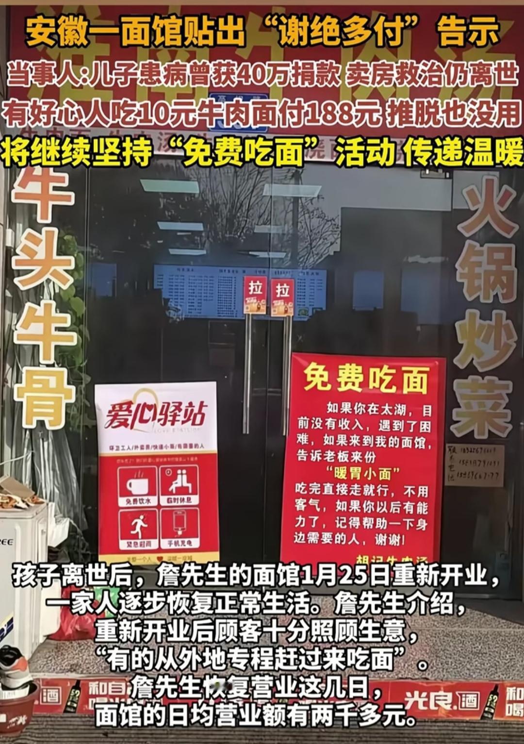安徽安庆的牛肉汤馆里,“谢绝多付”的红告示透着执拗——老板詹先生曾因儿子重病收过40万捐款,卖房救治仍没留住孩子。重开后顾客抢着多付钱,他推不掉才贴了告示。 10元牛肉面被硬塞188元,外地顾客专程来“捧场”,善意涌进门时,詹先生没沉溺感恩,反而挂出“免费吃面”牌:遇困者报“暖胃小面”就能免单,只盼对方日后帮他人。 如今面馆日均营收两千多,够养全家。他说“被帮过,得把爱传下去”,这红底白字的告示和免费牌,是被暖过的人,把接住的光,又递向了下一个需要的人。