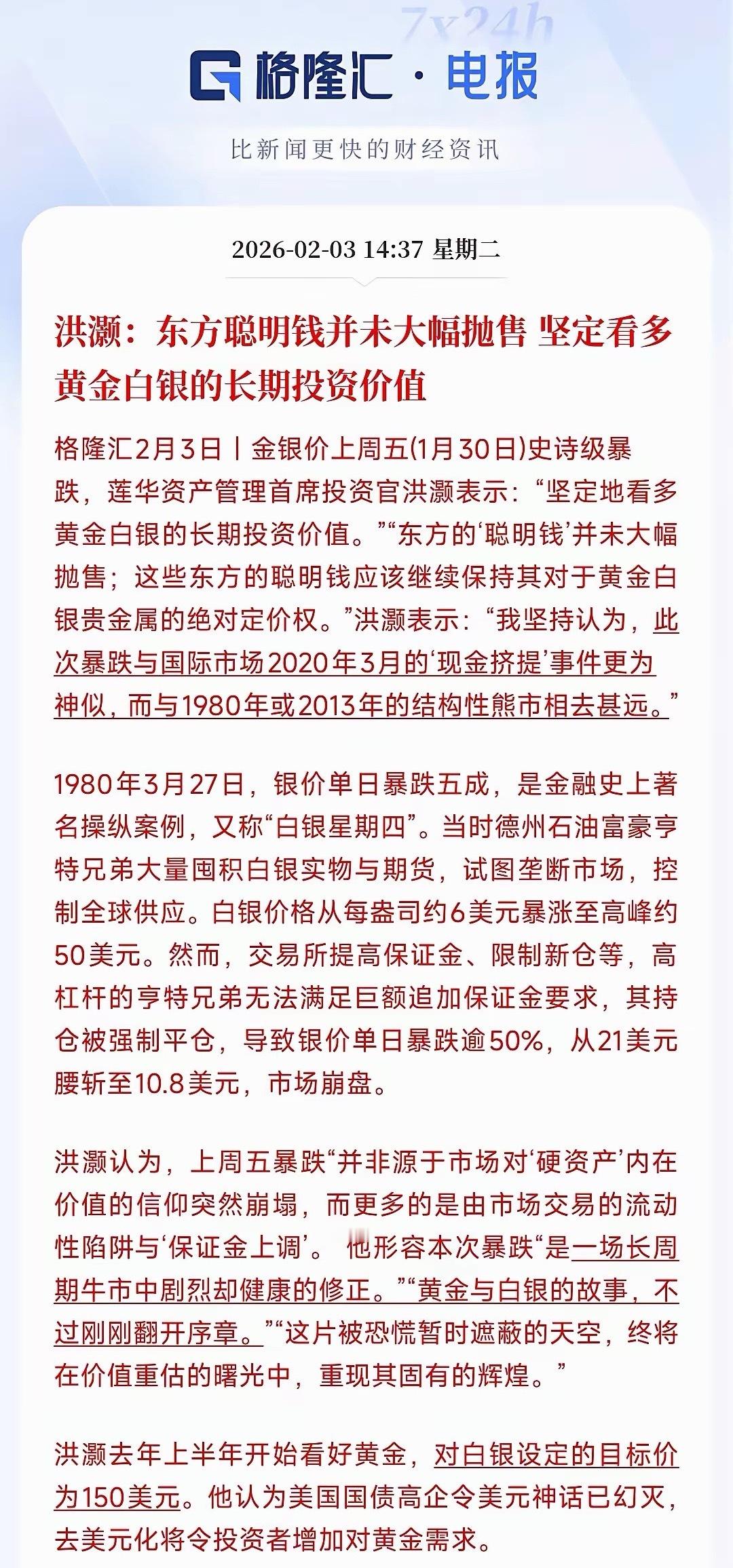 黄金,白银的行情到底结没结束,看看著名投资官的观点莲花投资官表示:坚定看多黄金白银的投资逻辑,上周的暴跌只是恐慌暂时掩盖了价值,后续价值重估还会涨。其实两天黄金白银暴跌30%以上完全就是恐慌情绪在蔓延,如果黄金白银真的无法支撑了不会这么迅速的下跌,会一点点的跌下去,其中还有反复。这轮下跌主要就是沃什被提名美联储主席造成的,不过今天辟谣沃什的政策“鹰中带鸽”。而且最重要的是很多国家央行还在储备黄金,并没有抛售的,这就是托底。今天黄金和白银都暴力反弹了,目前黄金涨5.28%,白银涨了8.78%。