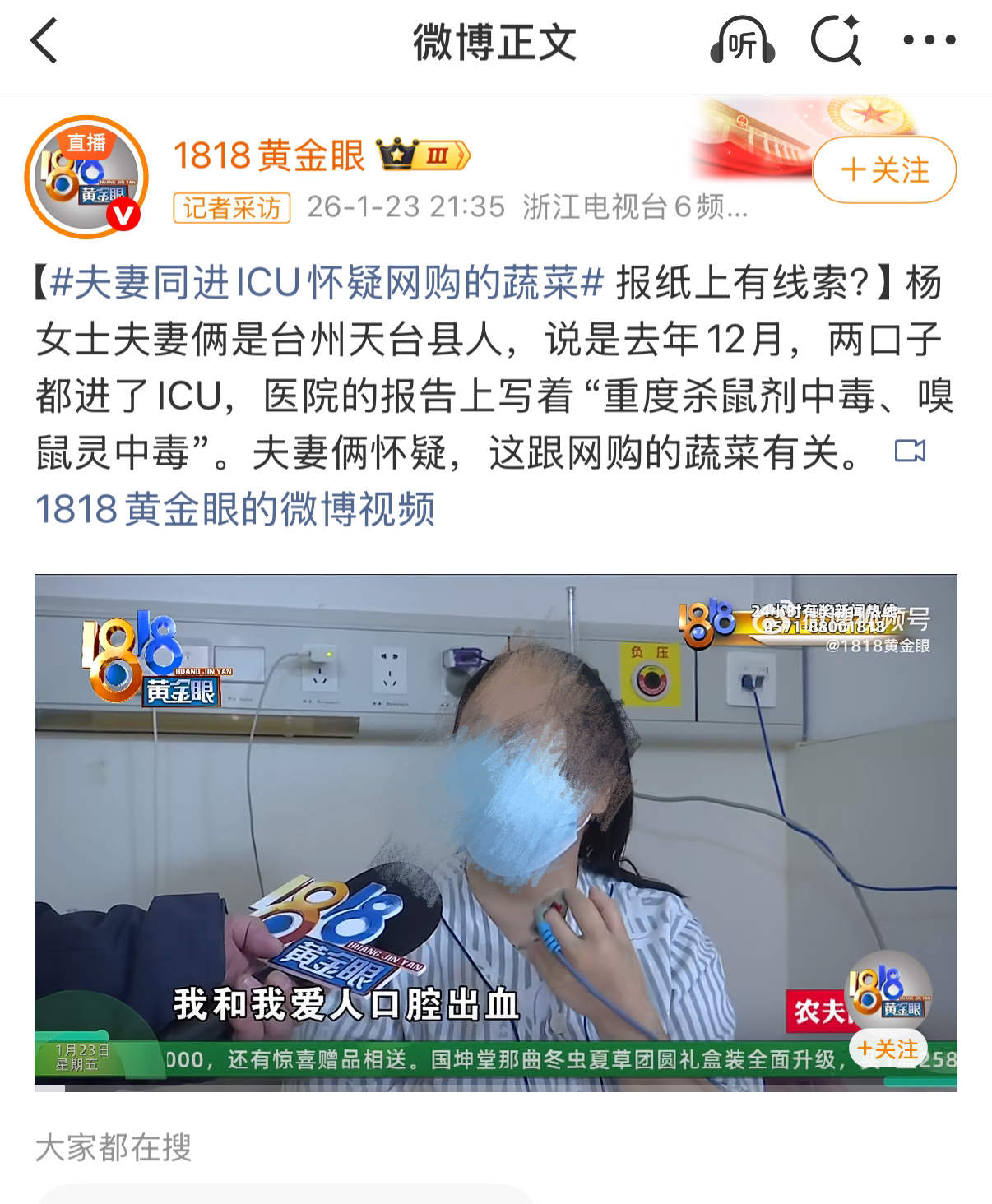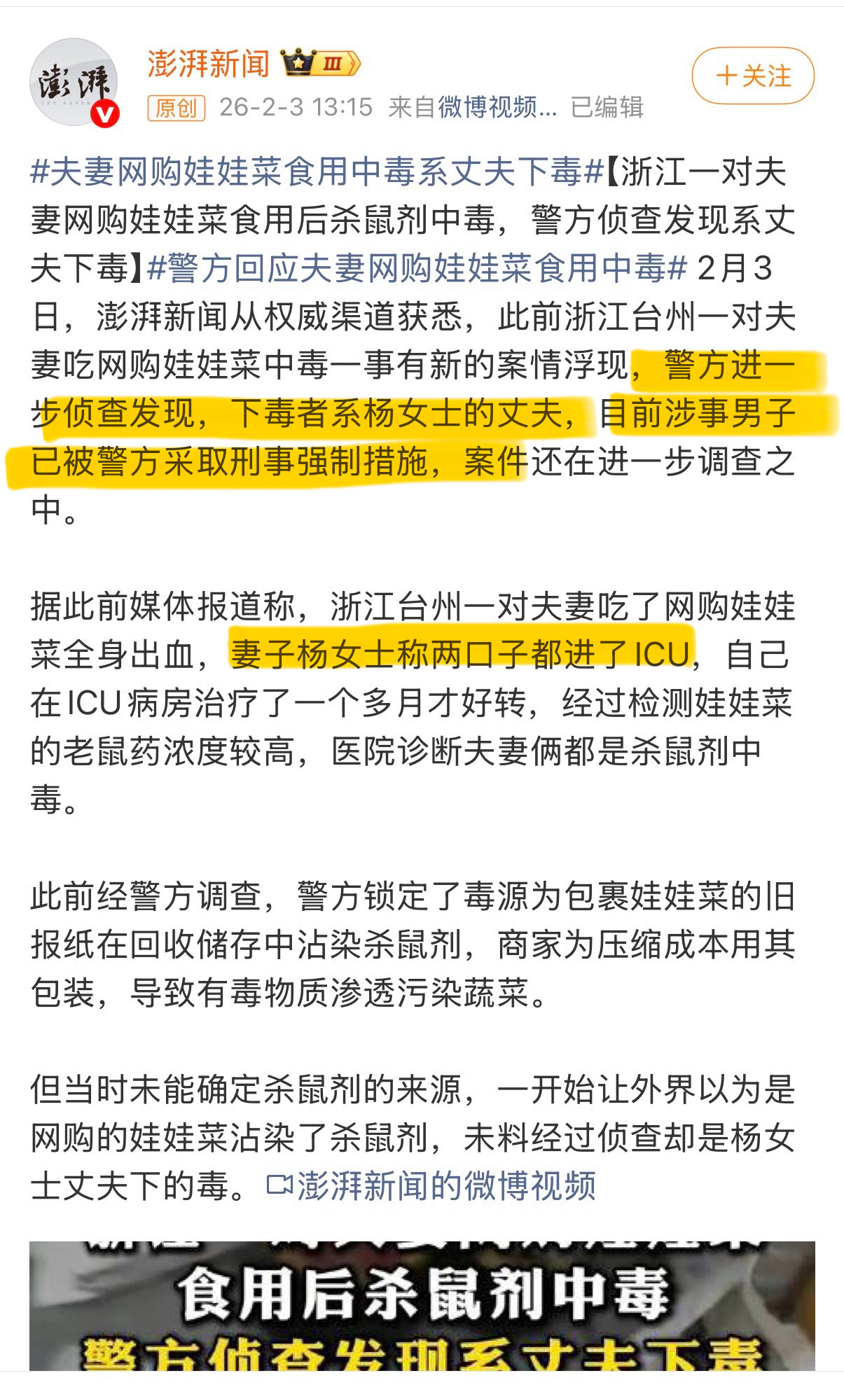 夫妻吃网购娃娃菜溴鼠灵中毒进ICU,全网先骂商家,可没想到结局反转,投毒的竟然是