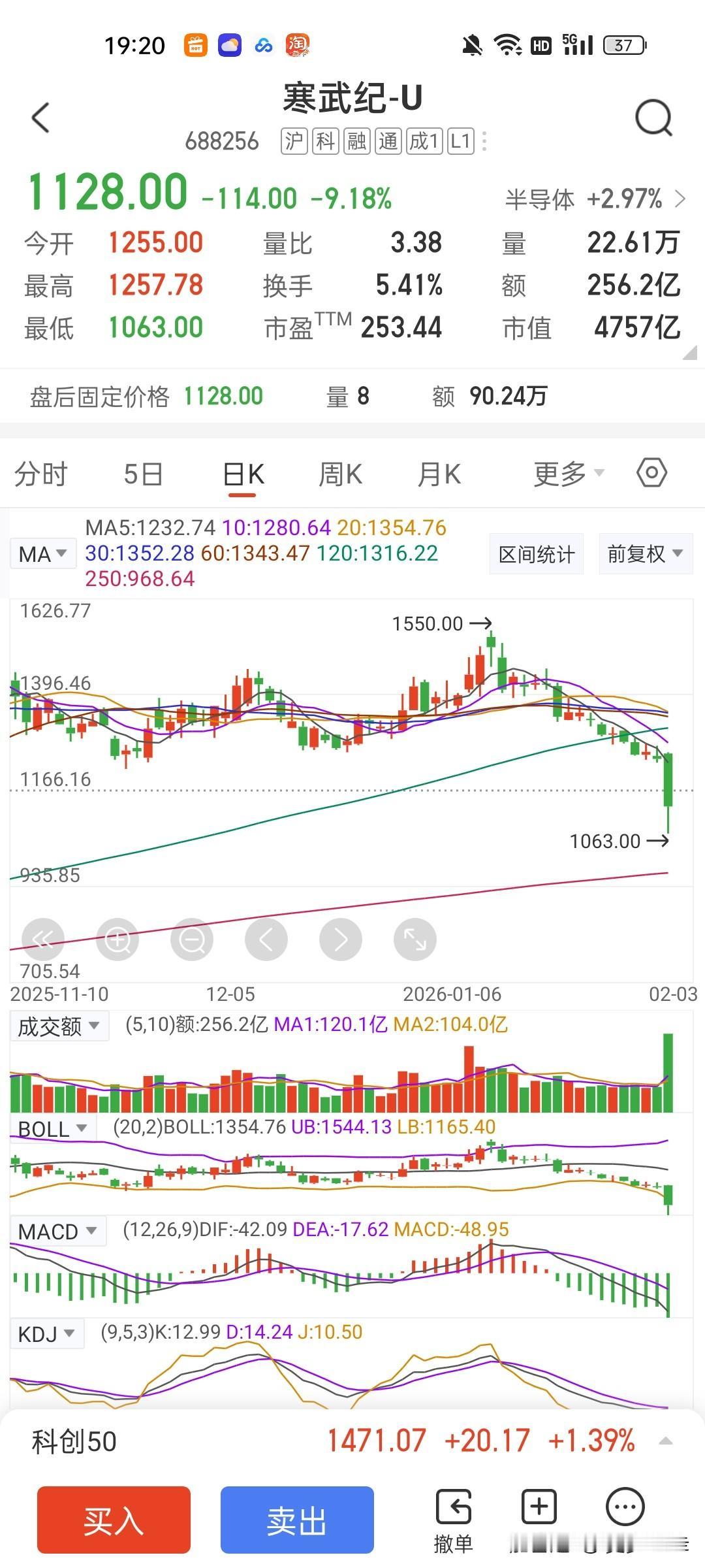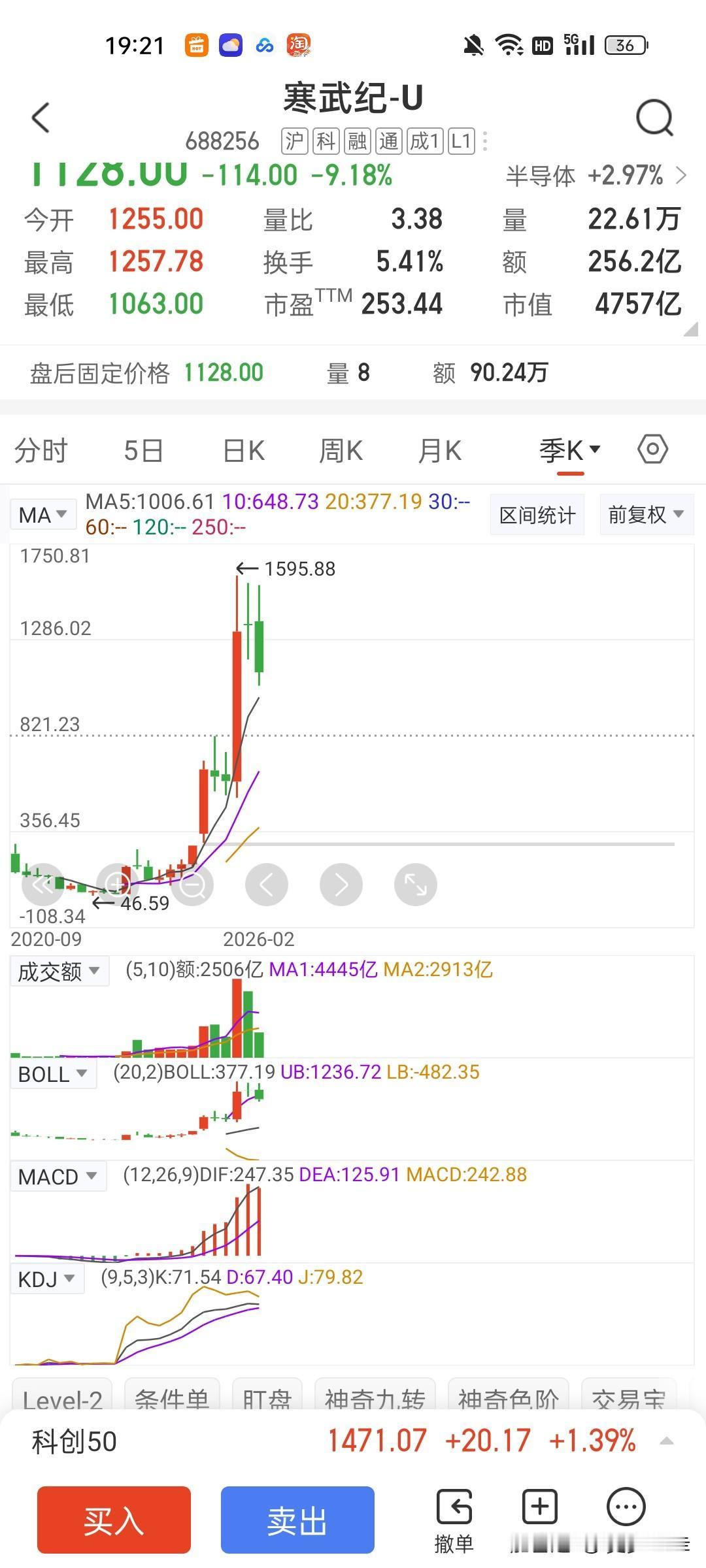 寒王-寒武纪终于开始了中期调整!月线看,已经跌破了5月均线。周线看是三重顶结构,