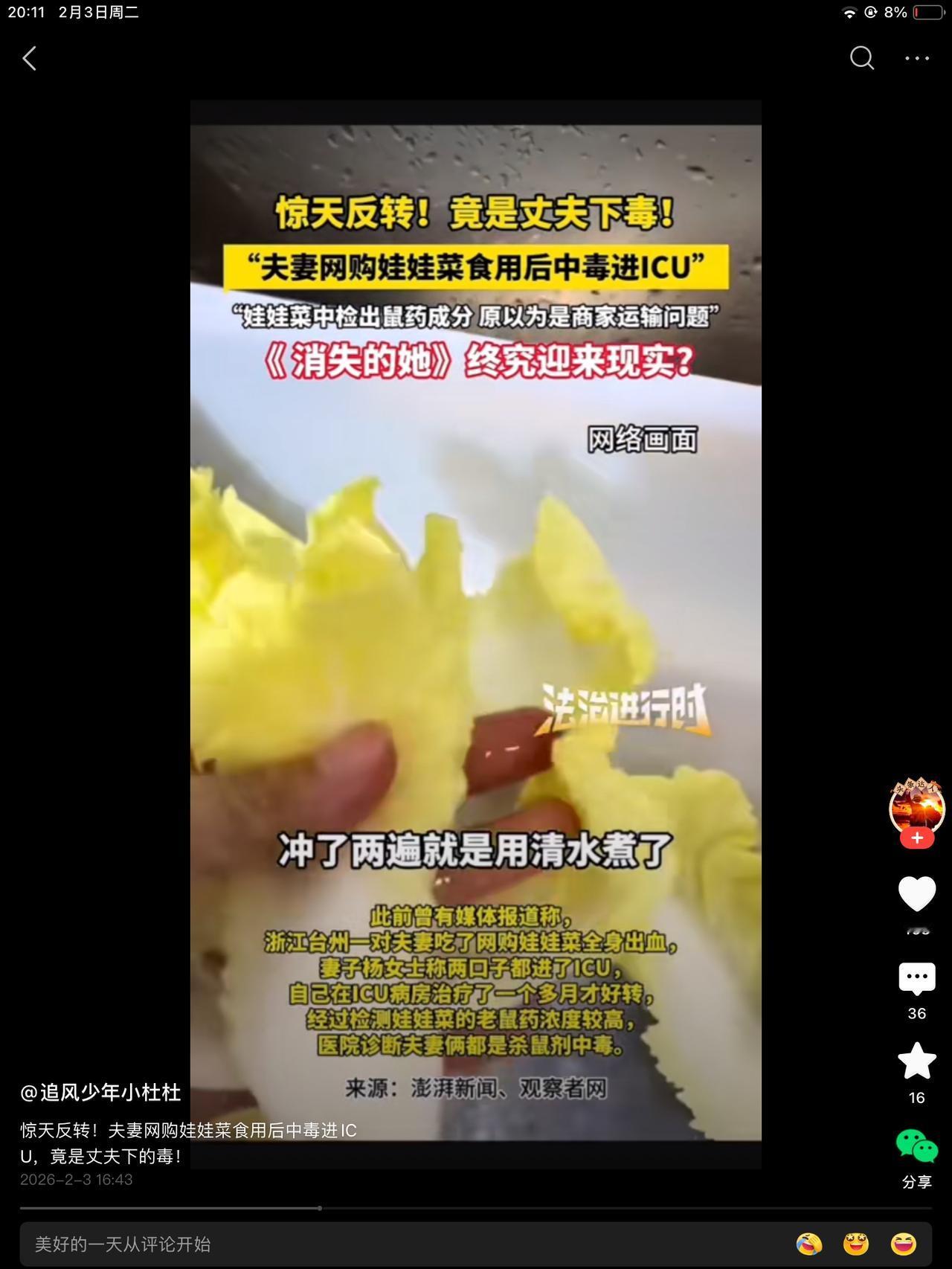 消失的她再次上演。还以为是商家农残超标,买个娃娃菜竟然吃中毒了,不曾想,最后的结果是老公下毒。这年头儿,还能相信谁啊?老公一口没吃吗?没记错的话,这家店铺关门了吧!店铺老板得罪谁了! 这女人也是太倒霉了,还好抢救回来了,这男的,奔着让这女的噶去的。差了一点。差一点就成功了! 现在这男的已经被控制了!原因尚且不知道。