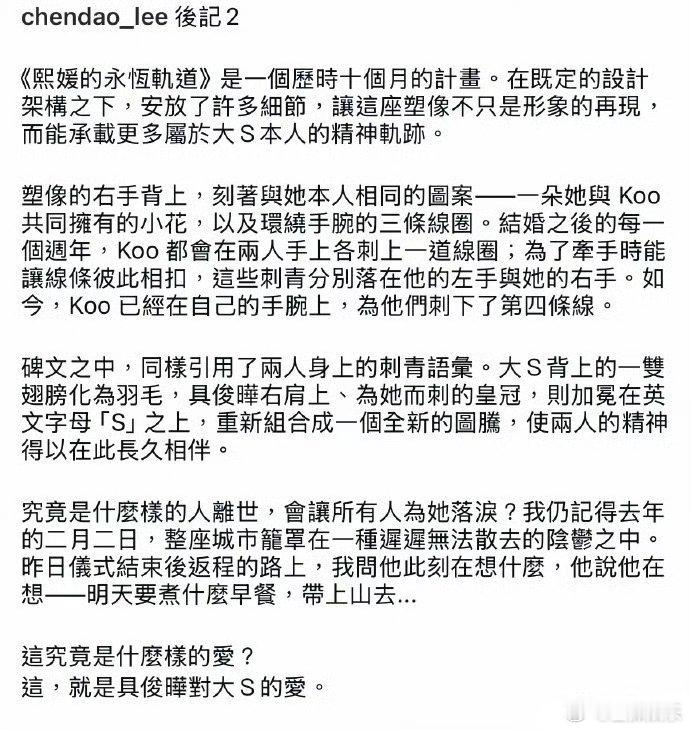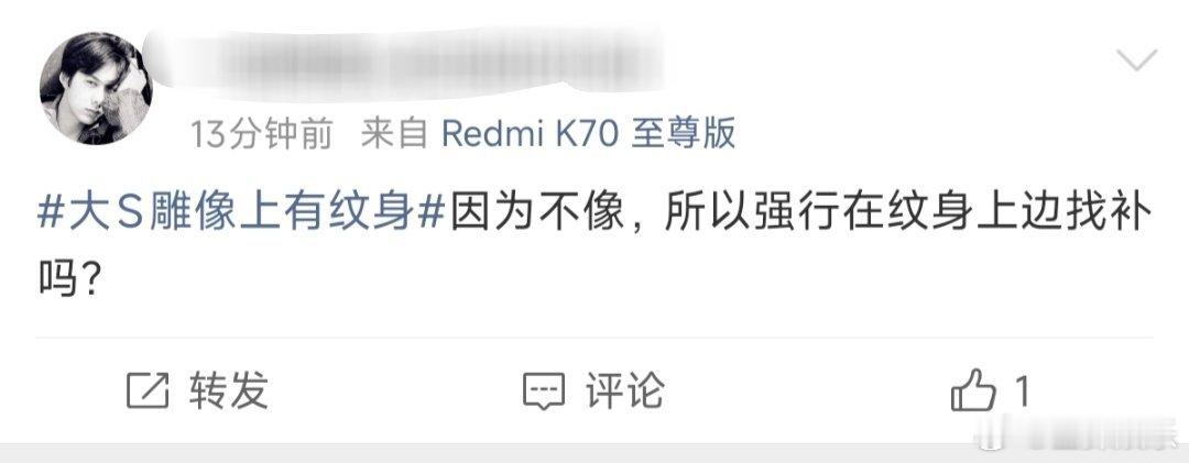 大S雕像上有纹身对于大S的雕像网友发现很多不合理的地方1.为什么具俊晔说是亲自设计的,现在又出来一个设计师解释2.为什么大S的雕像一点都不像大S(图一是雕像与大S早期和小时候的对比)3.大多数人认为大S在频繁被其家人以爱之名消费
