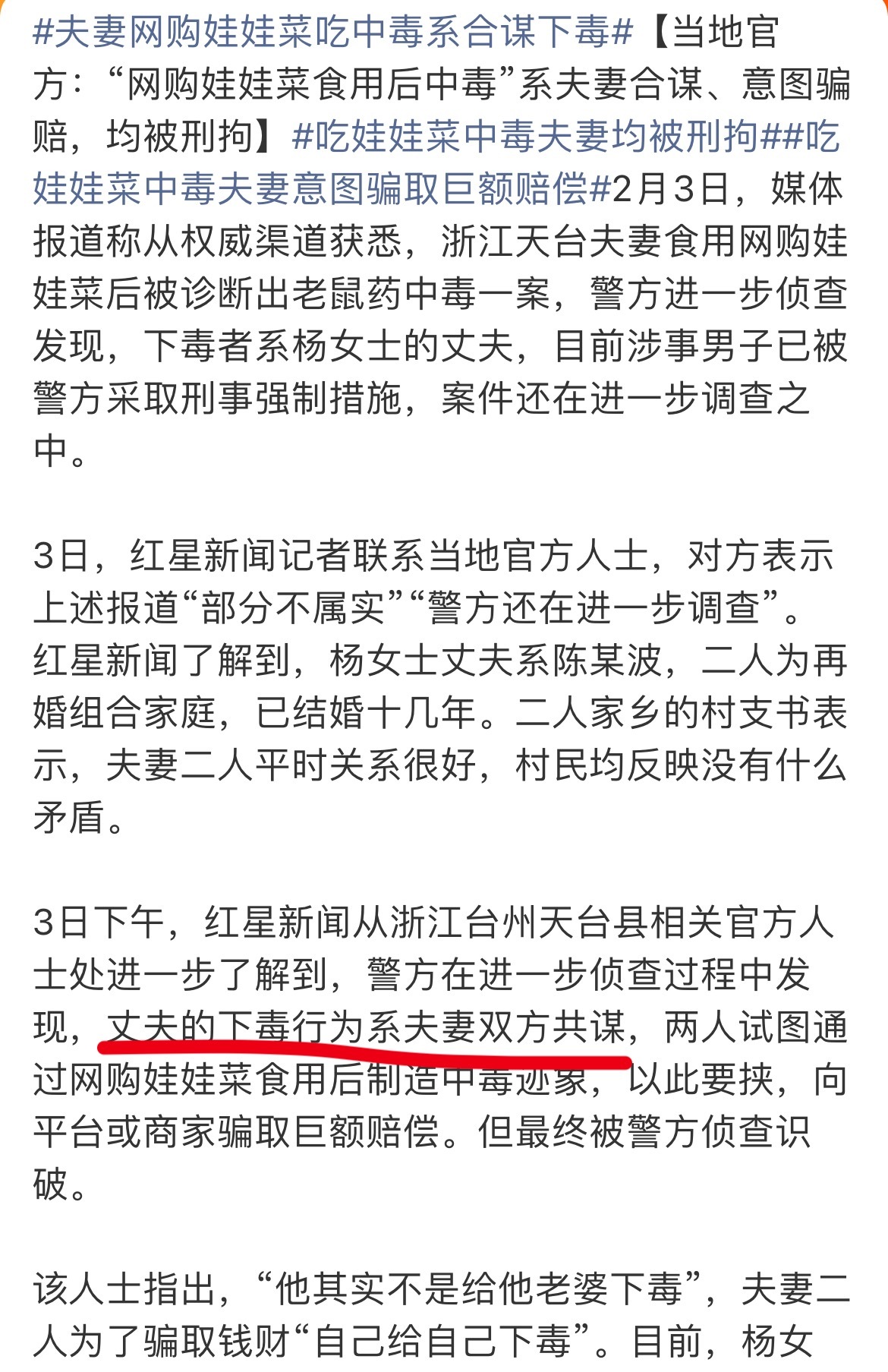 吃娃娃菜中毒夫妻均被刑拘什么?!这真是反转再反转了,先是网传是丈夫下毒,最后说是双方共谋,这也太狠了吧,自己毒自己