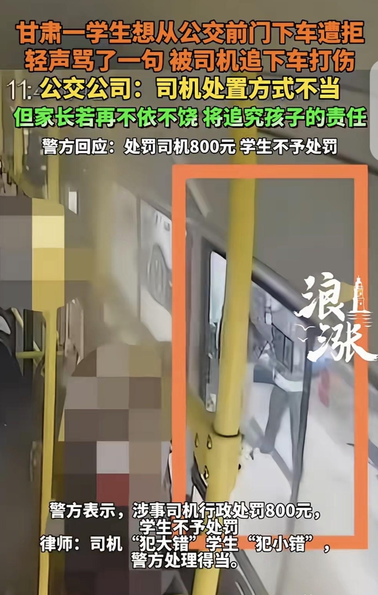 一句轻骂,一记重拳, 车门关上后谁在发抖。 那天中午11点46分,会宁9路公交停在瑞林苑路口站。 小户,16岁,穿校服,第三次问司机能不能从前门下车,声音不大,司机回了句“后门不能下?”,他就转身往车后走,嘴里嘟囔了一句脏话。 监控里看得清:司机解开安全带、推开防护栏、冲下去,一把推他肩膀,接着一拳打在头上。 整个过程不到一分钟。 小户鼻子肿了,耳朵嗡嗡响,后来医生说他半夜惊醒、手心冒汗,是急性应激反应。 司机被罚800块,没拘留。 小户没被罚,警方说他那句话够不上侮辱,只是孩子气的牢骚。 公交公司一开始说“要追究孩子的责任”,后来撤回了. 没人教过司机怎么扛住高峰期的烦躁,也没人告诉小户,憋着火比骂出来更伤自己。 规则写在纸上,可车上没空调也没心理医生。 司机喘着粗气开车,学生攥着书包带低头,车门一开一关,像在吞吐日常里那些没说出口的委屈。 车门关上,车开走了。