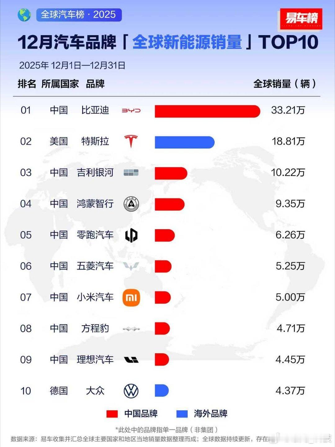 比亚迪太猛了!2025年汽车品牌『全球新能源销量』榜单揭晓,比亚迪以360.47万辆登顶全年榜首,单月销量也以33.21万稳居第一,稳稳的力压特斯拉。中国品牌在前10榜单中,就占有7位。吉利银河、五菱汽车也紧随其后,凸显出中国新能源汽车展现出的核心引领地位。比亚迪大v聊车