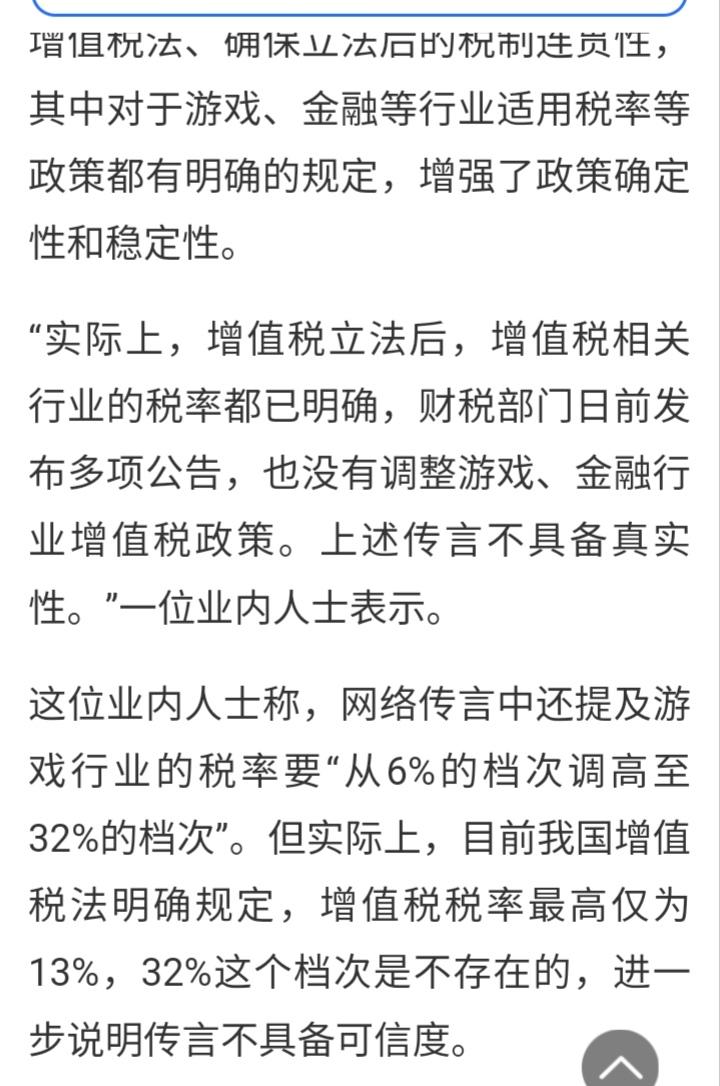网络谣言太可恶了!一则游戏行业增值税税率要从“6%的档次调高到32%的档次”的网络谣言,直接带崩了腾讯控股的股价。 腾讯控股今天收盘下跌2.92%,最低下探到561港元,收盘价581港元。 这个网络谣言也太不靠谱了!增值税法明文规定增值税税率最高为13%,它却耸人听闻的生造出来一个32%吓人!居然还有那么多人相信。 谣言止于智者。相信通过辟谣,腾讯控股股价很快会回升并创出新高的。