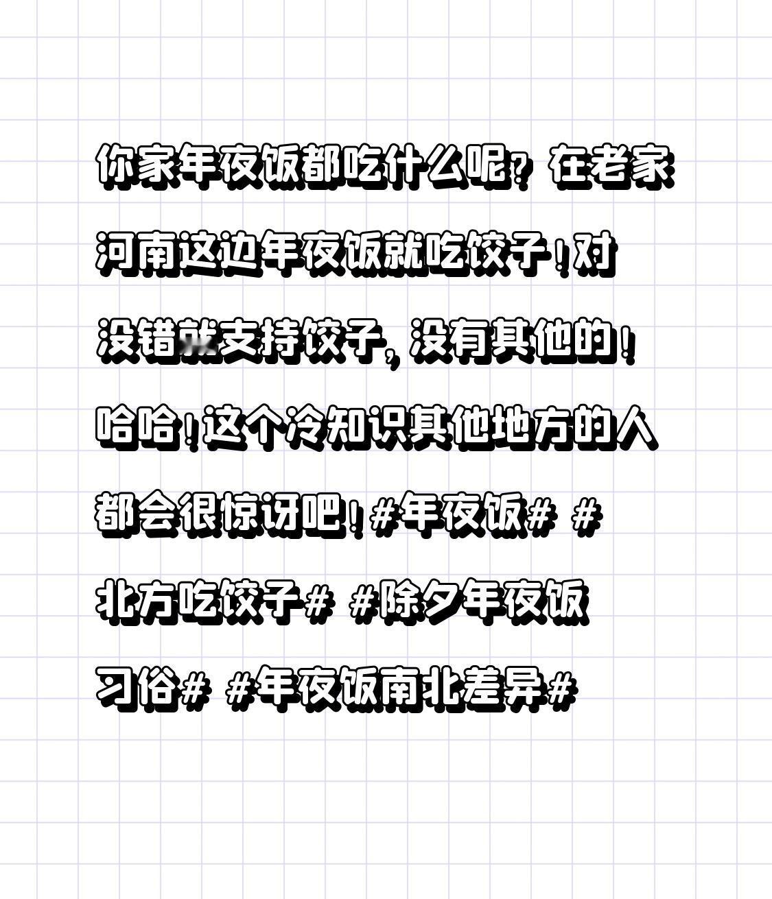 你家年夜饭都吃什么呢?在老家河南这边年夜饭就吃饺子!对没错就只吃饺子,没有其他的!哈哈!这个冷知识其他地方的人都会很惊讶吧!年夜饭 北方吃饺子 除夕年夜饭习俗