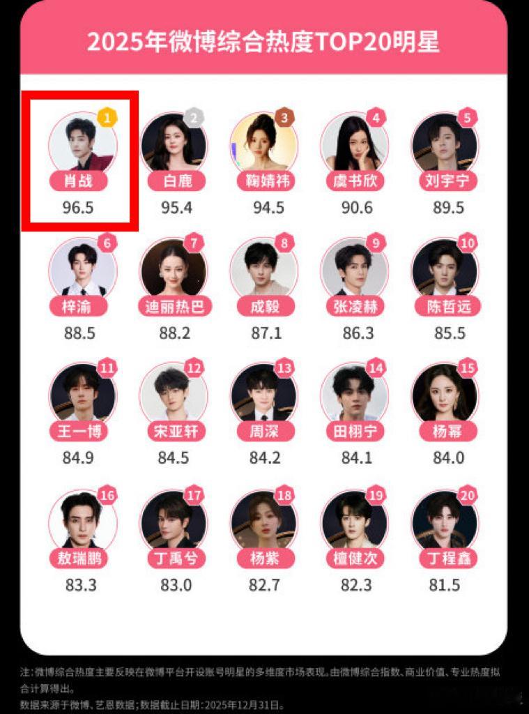 微博之夜肖战2025微博综合热度TOP1肖战2025商业价值TOP1肖战藏海传斩获年度三大荣誉2025微博娱乐白皮书出炉:肖战 :个人➕作品=影视口碑三丰收=横扫登顶➤微博综合热度TOP1:肖战➤商业价值TOP1:肖战➤高专业热度明星:肖战 ➤剧集影响力榜TOP1:藏海传 ➤微博剧集传播榜TOP1:藏海传➤微博剧集讨论榜TOP1:藏海传肖战蝉联两年微博综合热度TOP肖战白鹿热巴商业价值TOP3微博之夜
