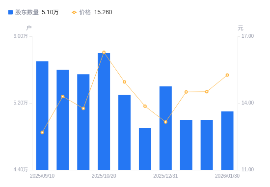 日期A股户数(户)流通A股户均持股数(股)户均持股市值(万元)2026-01-305100032817.6550.082026-01-205000033474.0048.572026-01-095000033474.0048.542025-12-315400030994.4440.762025-12-174900034157.1447.342025-11-205300031579.2547.212025-10-205800028856.9046.982025-09-305545030183.9541.532025-09-195600029887.5042.742025-09-105700029363.1637.23
