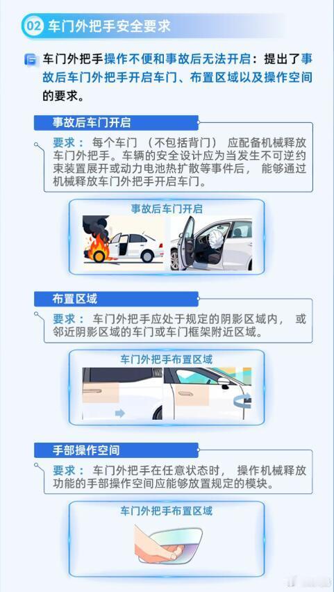 汽车门把手强制性国标发布 工信部最近发布了关于汽车门把手的强制性国家标准《汽车车门把手安全技术要求》(GB 48001-2026),其中明确对车门内外把手提出了要求: