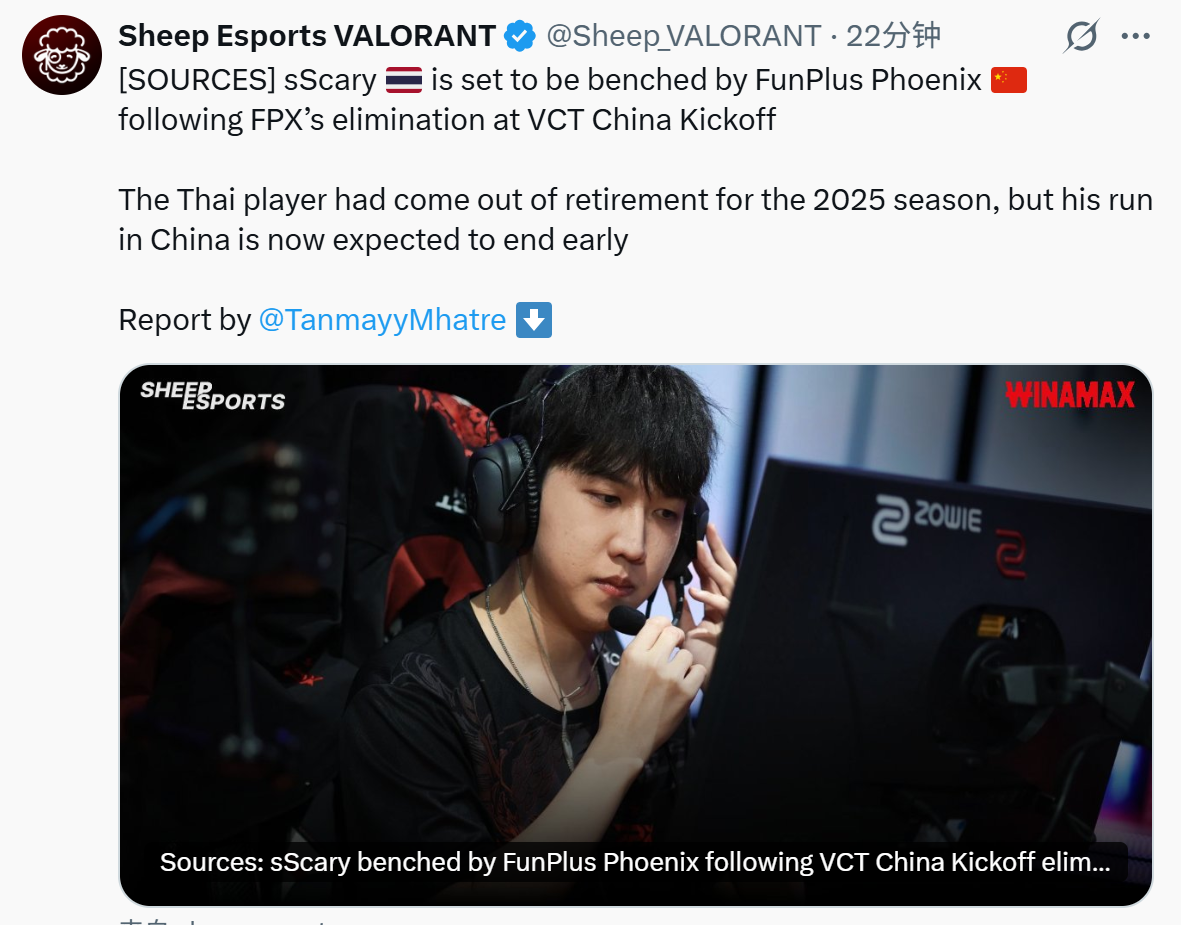 "FPX在VCTCN启点赛遭遇三连败后被淘汰,据本报消息人士透露,他们已经开始调整阵容,sScary被下放至替补席。这位泰国选手在2025年几乎没有参加过任何比赛,此前他曾复出征战CN联赛,但如今看来,他的职业生涯似乎要提前结束了。