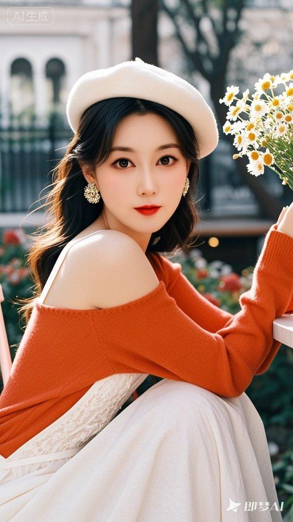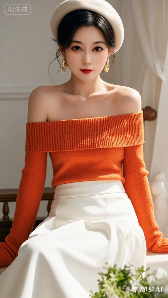 她穿着一橘红色的露肩毛衣,搭配一条白色长裙。她还戴着一顶白色的贝雷帽和金色耳环。整体给人一种时尚、优雅的感觉。清纯风,柔和色调,