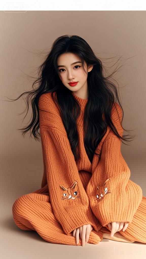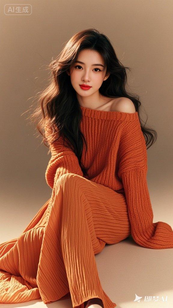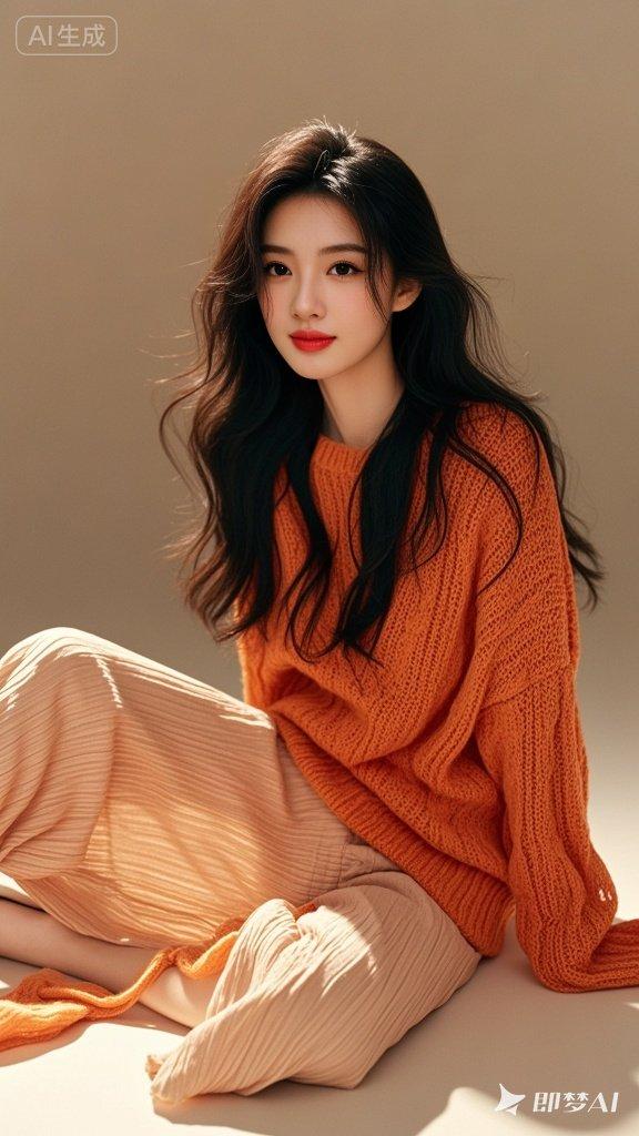 慵懒风佳人,橘色宽松针织衫,飘逸阔腿裤,随性不羁魅力,丝般披肩长发,樱桃小嘴,俏