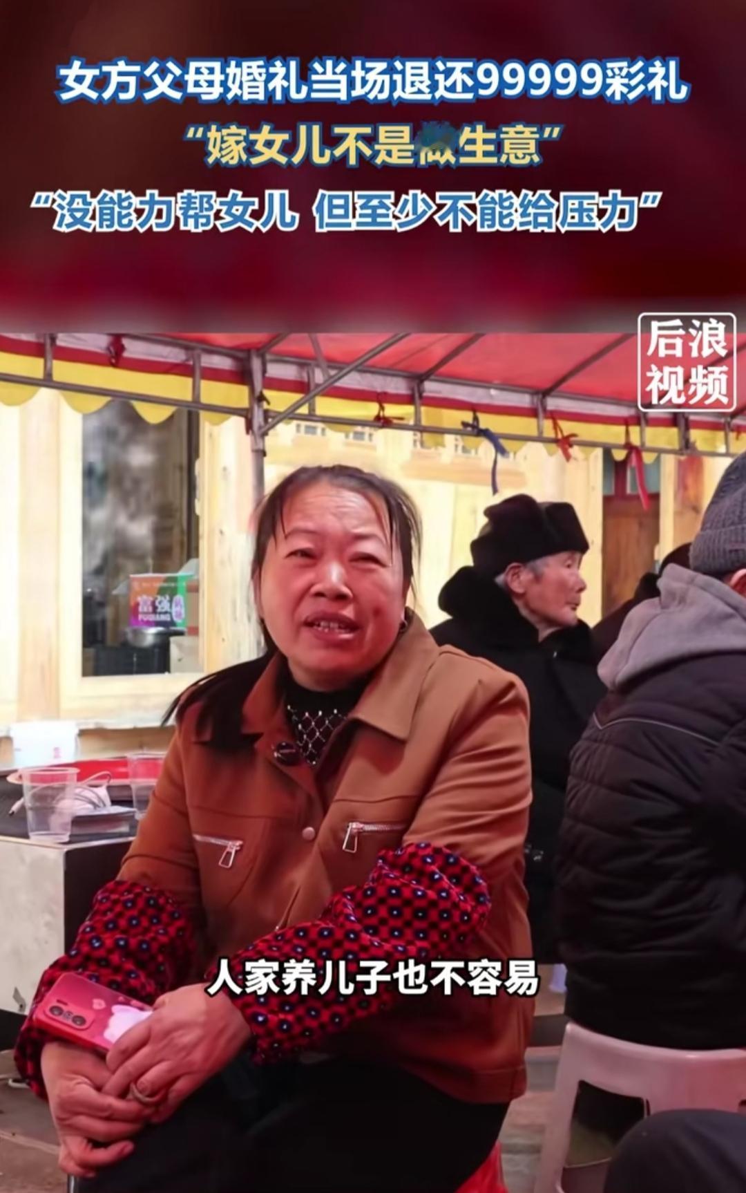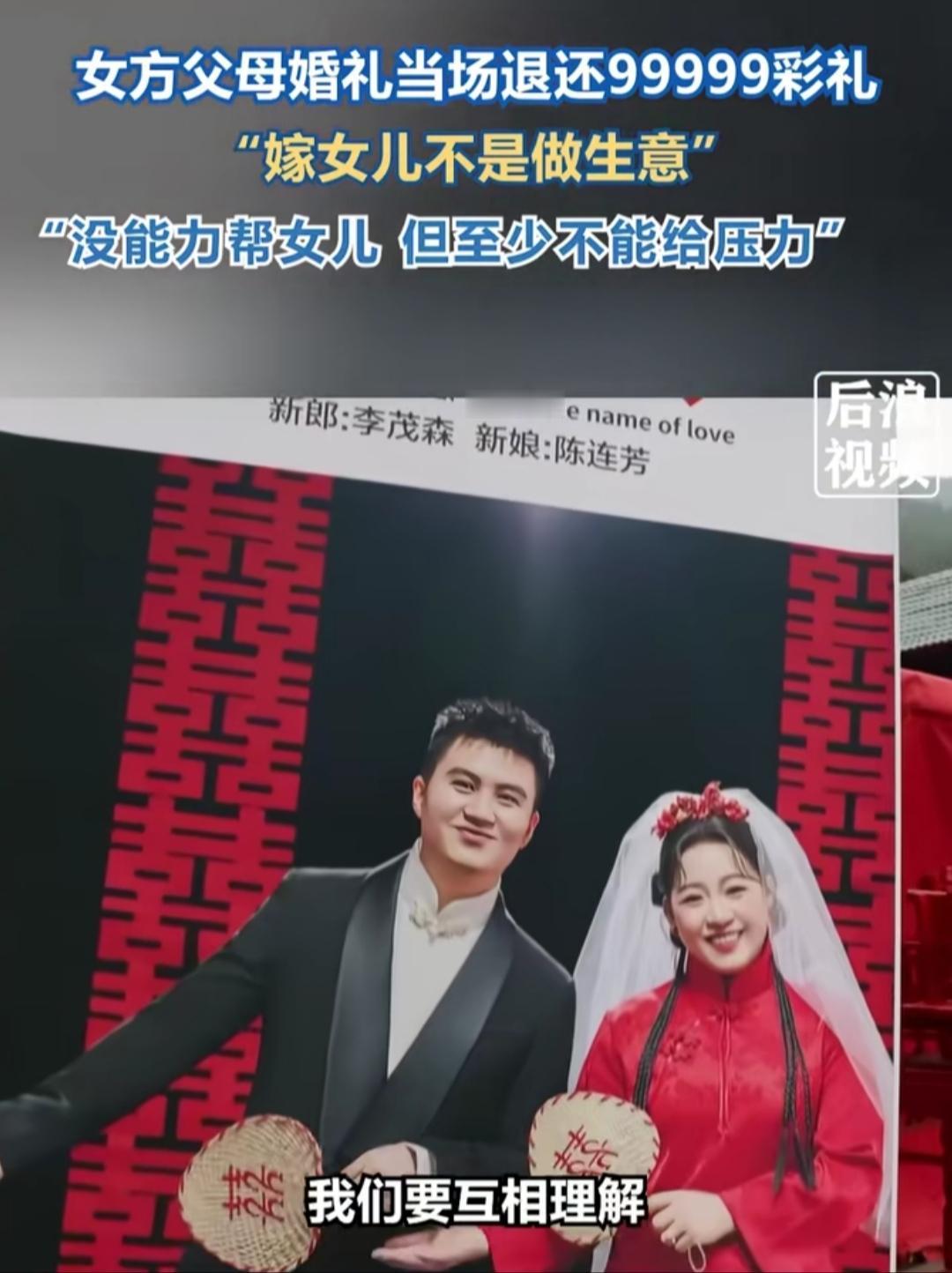 谁能想到,一场普通婚礼上,岳父的一个举动竟戳中无数人泪点!没有高额彩礼的拉扯,没有世俗的斤斤计较,只有最朴素的真诚,让在场宾客忍不住拍手叫好。 婚礼现场,岳父接过女婿双手奉上的99999元彩礼,转身就原封不动还了回去。他握着新人的手郑重叮嘱,嫁女儿不是做生意,不用彩礼撑场面,只要小两口往后和和美美过日子。说完还掏出准备好的6万嫁妆和压箱底启动金。 这份通透背后藏着一段温暖过往,老人年轻时结婚,岳父母体谅他家境不好,一分彩礼没要还全力帮衬。如今他把这份善意代代相传,也正好呼应了当地推广“零彩礼”的文明婚嫁新风尚。 彩礼从古至今都是婚嫁绕不开的话题,有人把它当成诚意的试金石,有人因它愁白了头。这场婚礼没有对错之分,却让我们看到,好的婚姻从来不是用金钱衡量,而是藏在长辈的体谅和新人的珍惜里。