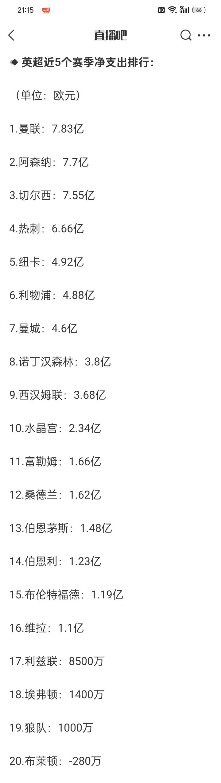 英超近5年净支出排行:曼联7.83亿领跑,枪手切尔西位列2、3,热刺第4 利物浦第6曼城第7 2月3日 外媒根据德转数据列出了英超近5个赛季的净支出排行,曼联7.83亿居首、阿森纳7.7亿第2、切尔西7.55亿第3,热刺6.66亿第4,纽卡4.92亿第5,利物浦4.88亿第6 ,曼城4.6亿第7,布莱顿则是唯一有净收入的球队
