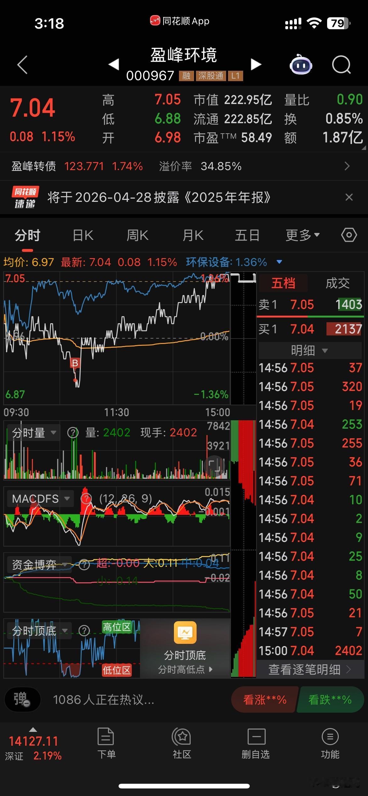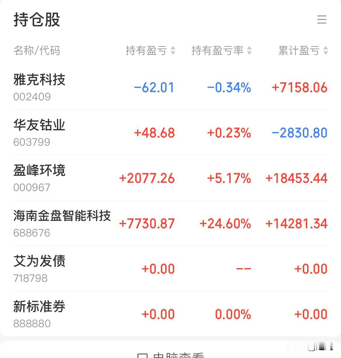 好长时间没有更新炒股动态了。每天更新感觉有点疲了。翻来覆去就是这些内容。以后每月不定期更新几次算了😐。本月已经过去2个交易日了。昨天大跌我是盈利的,今天大涨我是小盈利,主要是仓位较低。目前手上4个股票。盈峰今天低点第二次加仓,股数来到了6千。金盘4百股,雅克和华友是2万左右的市值。今年前两个月都是红盘,算了下应该是连续9个月盈利。虽然赚得不多贵在稳定。秘诀是分仓买入,高抛低吸,感觉形势不对,跑得比兔子还快[捂脸]