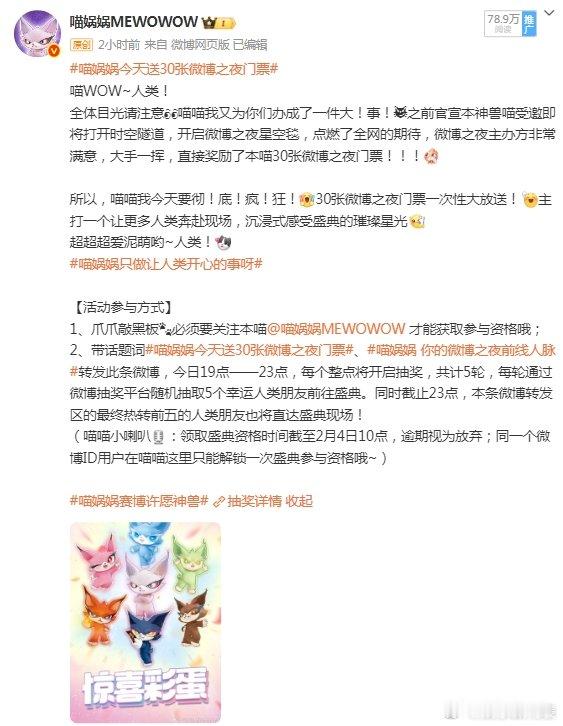 喵娲娲 微博之夜送票永动机 永动机已启动!这波是喵娲娲带着30张微博之夜门票在疯