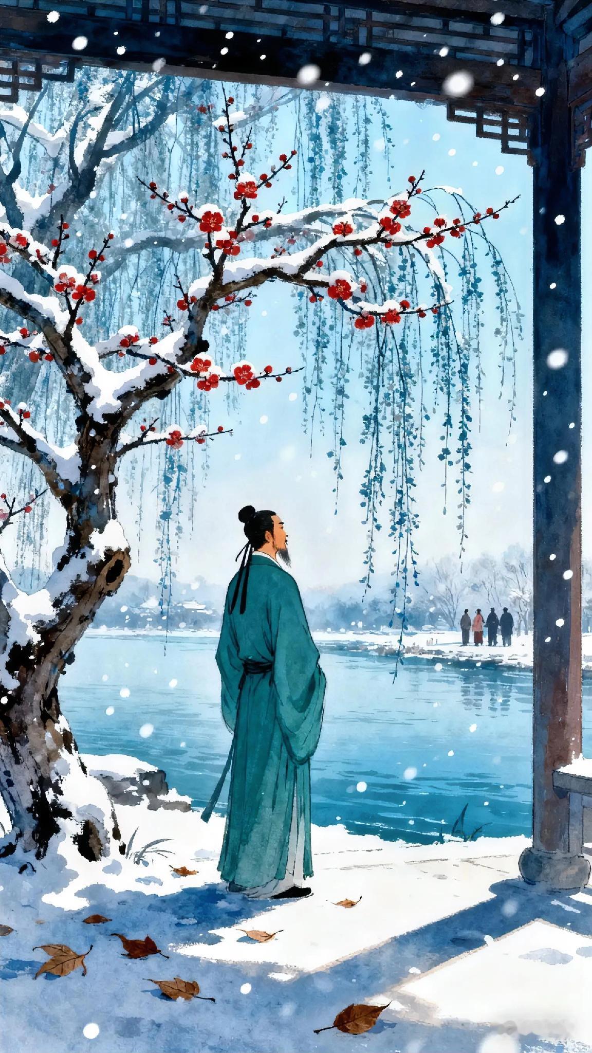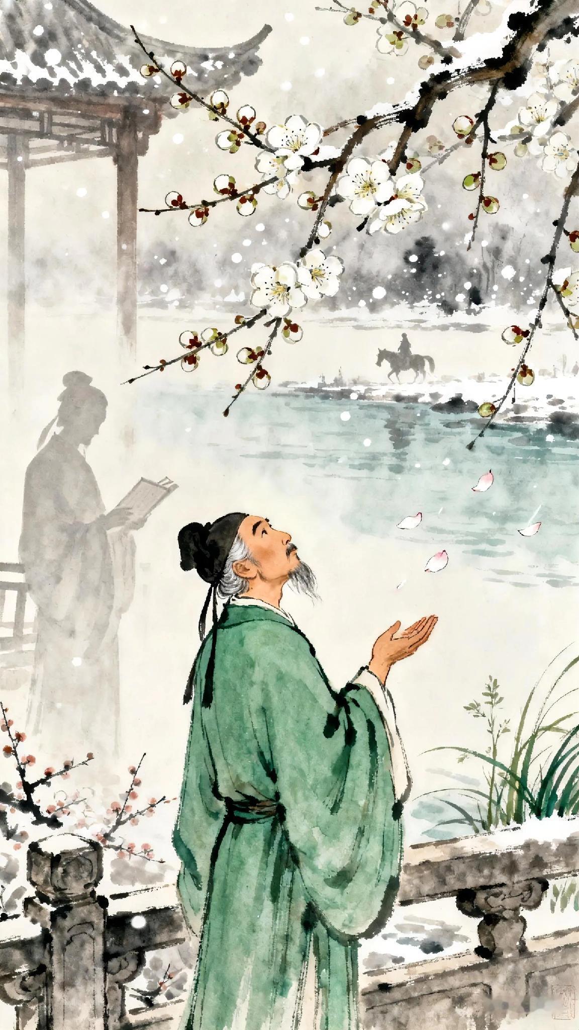 《和裴迪登蜀州东亭送客逢早梅相忆见寄》 唐、杜甫。 东阁观梅动诗兴, 还如何逊在扬州。 此时对雪遥相忆, 送客逢春可自。 幸不折来伤岁暮, 若为看去乱乡愁。 江边一树垂垂发, 朝夕催人自白头。 现译: 杜甫在蜀州东亭赏梅时诗兴勃发,如同南朝何逊在扬州咏梅的雅事。面对飞雪遥忆故人,送客逢春却更添孤寂。 他感慨:幸而未折梅寄赠,免却岁暮的伤感;若真看到远方寄来的梅花,怕要搅动难解的乡愁。 江畔那株梅树已垂垂开花,朝夕相对,仿佛在催促游子早生华发——时光与乡思,都在花开花落间悄然流转。 杜甫 杜甫诗词赏析 长安杜甫 唐杜甫 杜甫诗歌鉴赏 唐杜甫词 古诗词