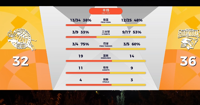 第二节比赛结束,浙江36-32领先新疆。