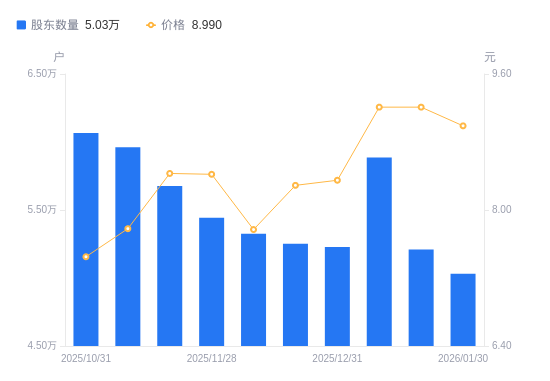 日期A股户数(户)流通A股户均持股数(股)户均持股市值(万元)2026-01-305032010629.399.562026-01-205208810268.609.462026-01-09588569087.798.372025-12-315228210230.498.542025-12-195252410183.368.442025-12-105325610043.397.802025-11-28544279827.308.272025-11-20567599423.547.942025-11-10596068973.446.982025-10-31606668816.656.57