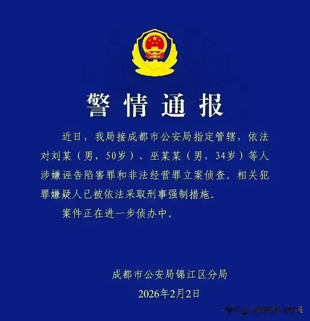 近期成都较受关注的刘某(刘虎)等人涉嫌诬告陷害罪、非法经营罪案…… 事件起因:2026年1月29日,刘虎(男,50岁)与巫某某(男,34岁)在微信公众号“法与情”发布文章《曾逼死教授的四川……,如今又把招商企业逼向破产》,内容涉及对当地官员及招商项目的相关指控。 2月1日下午,刘虎在重庆万州失联,家属报警; 2月2日14时38分,相关方面告知家属其被成都警方刑拘,并羁押于成都市看守所;随即发布通报相关人员已被采取刑事强制措施。 那么如何看待这件事情呢?我个人有三点看法! 第一,很多人都在关注一件事情:刘虎到底有没有违法犯罪的问题呢? 我个人的答案是:大概率是犯罪了,毕竟认定犯罪并不是一件多难的事情、毕竟犯没犯罪都是人家说了算的。 第二,为什么这件事情会受到如此关注呢?因为大家都在关心刘虎是不是被“犯罪”了。 毕竟刘虎写文章报道在前,涉嫌“犯罪”在后,时间上刚刚好。 第三,有句话叫做:立法必严、有法可依、选择性执行。 说句良心话,很多时候是人家不追究,要是全部按照法律法规办的话,估计很多人都要进去、很多企业都要停工停产。 最后我想说一句,这件事情最大的看点就是——舆论能否再次发挥威力❓