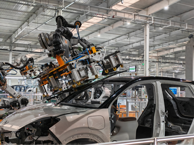 上汽通用五菱智能工厂“玻璃岛”作业现场,机器人凭借3D视觉系统进行毫米级精准装配。新华网东子寒摄