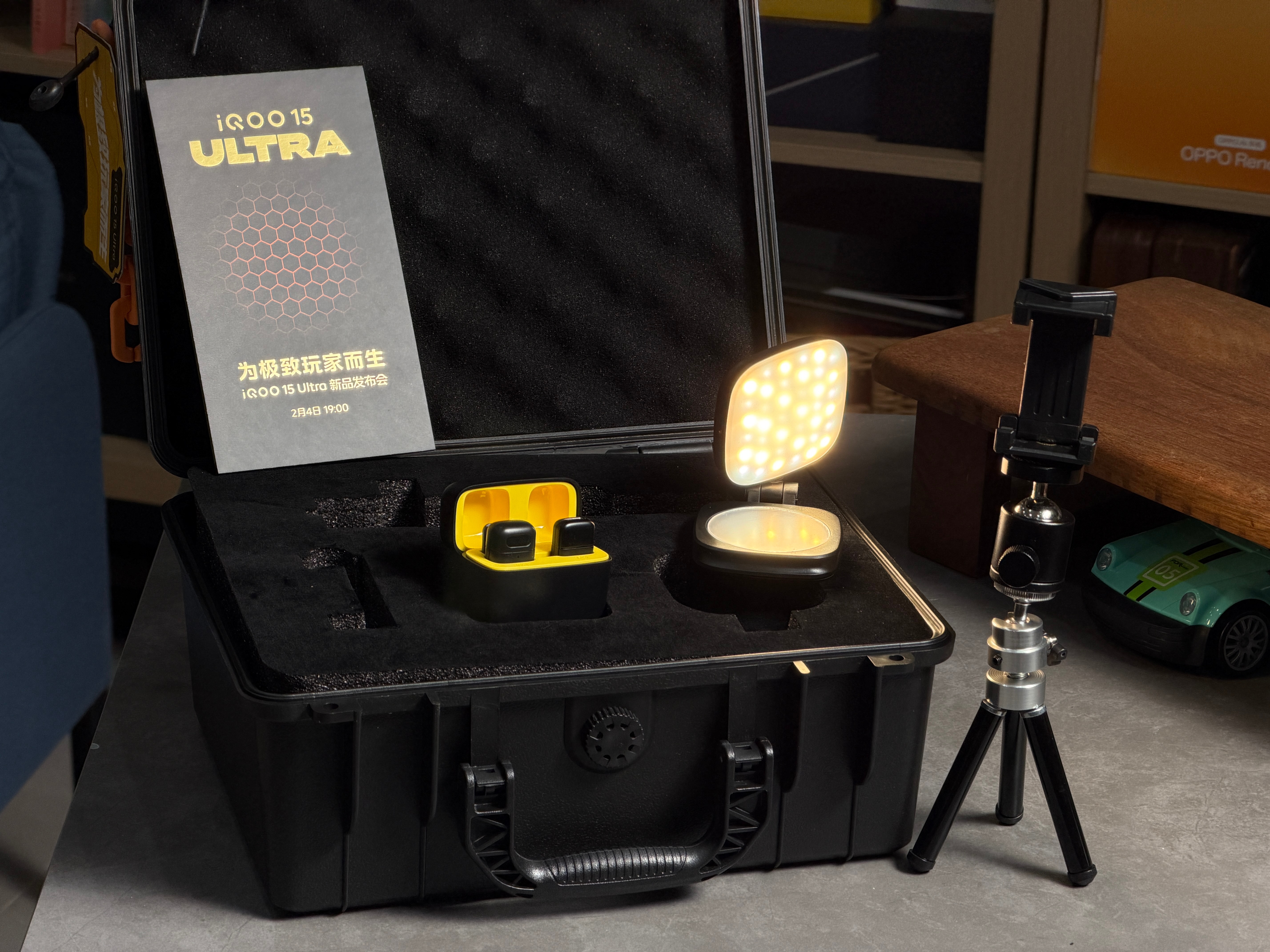 收到iQOO15Ultra邀请函、里面有手机支架、柔光灯、麦克风、一套做电竞直播的装备、暗示iQOO15U是电竞直播神器、明晚就发布、这是年底压轴手机、也是开年的性能怪兽、邀请函你们喜欢吗?我可以叫李老师抽给你们
