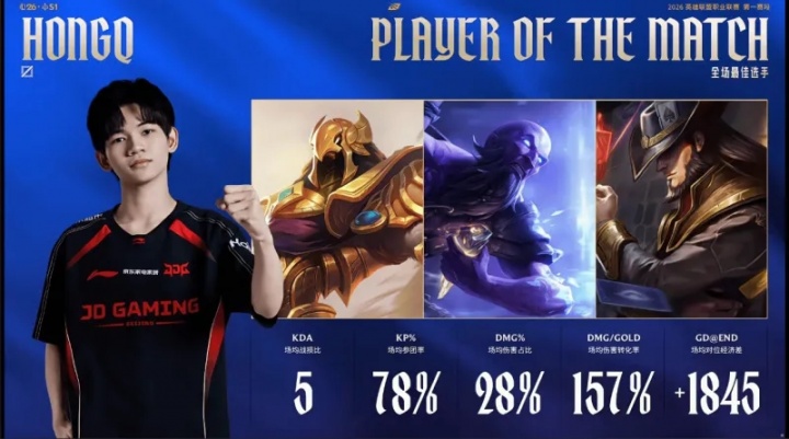 HongQ打出1800的场均对位领先,斩获JDG对阵IG大场MVP