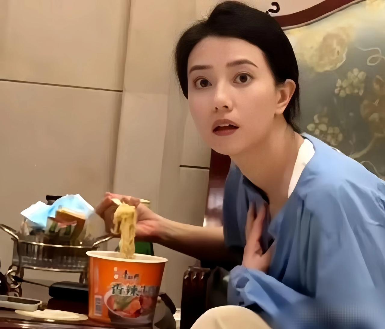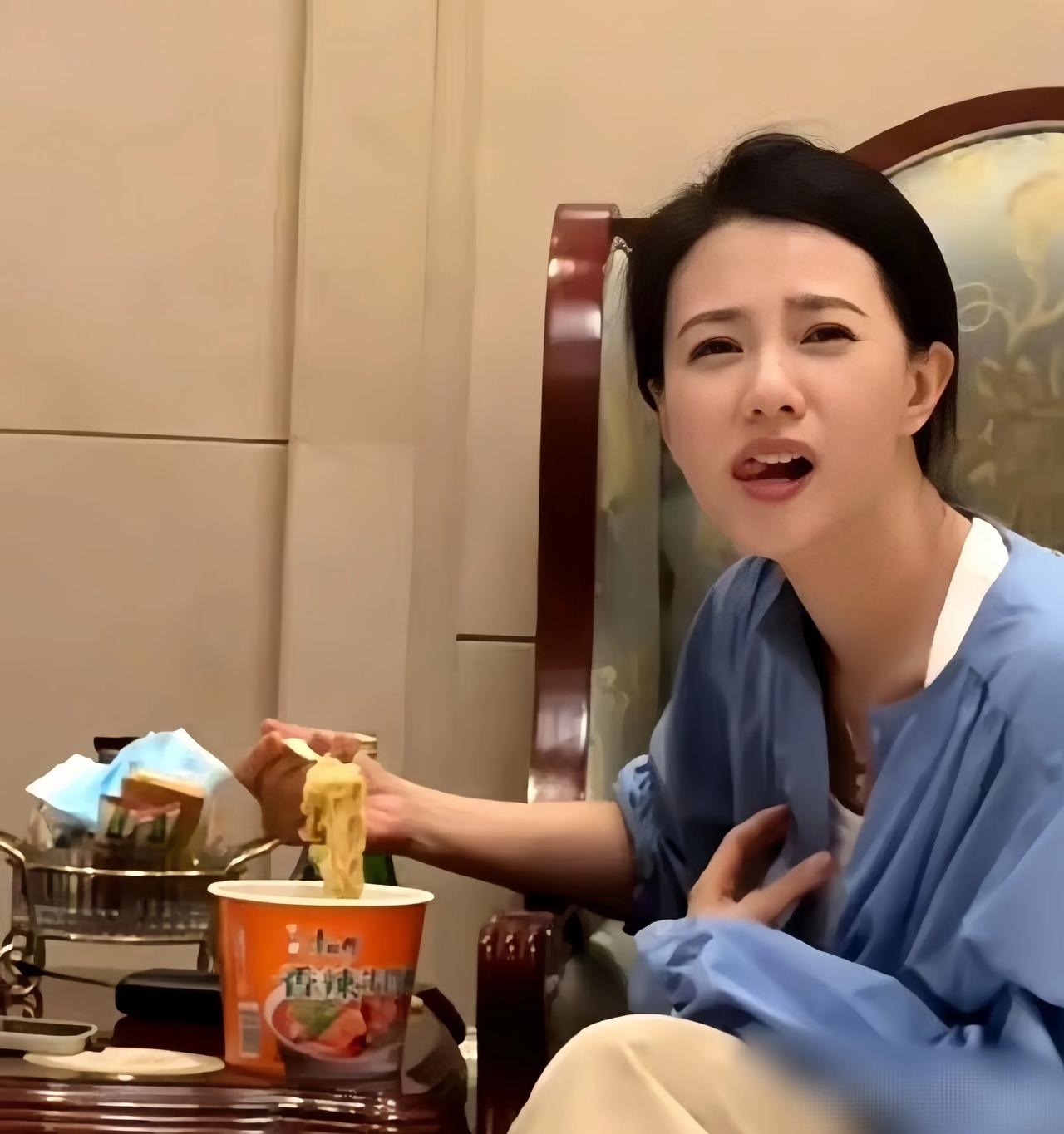高圆圆在等飞机时,吃泡面的情景。 估计当时很饿的缘故,她完全不顾形象的吃起了泡面