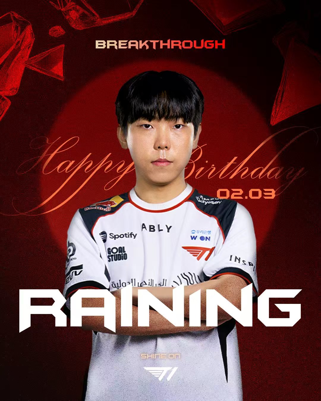 T1战队社媒更新:祝Raining选手28岁生日快乐