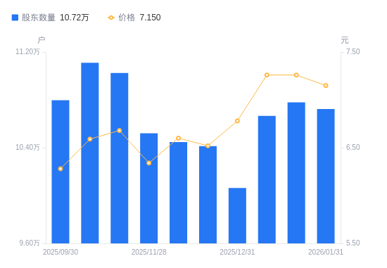 日期A股户数(户)流通A股户均持股数(股)户均持股市值(万元)2026-01-3110723143629.3331.192026-01-1010778943403.4731.512026-01-0910666443861.2631.842025-12-3110063446489.4331.522025-12-1910412644930.1829.292025-12-1010447044782.2429.562025-11-2810520644468.9528.192025-11-1011025642432.1628.342025-10-3111110042109.8127.752025-09-3010797343329.3527.21