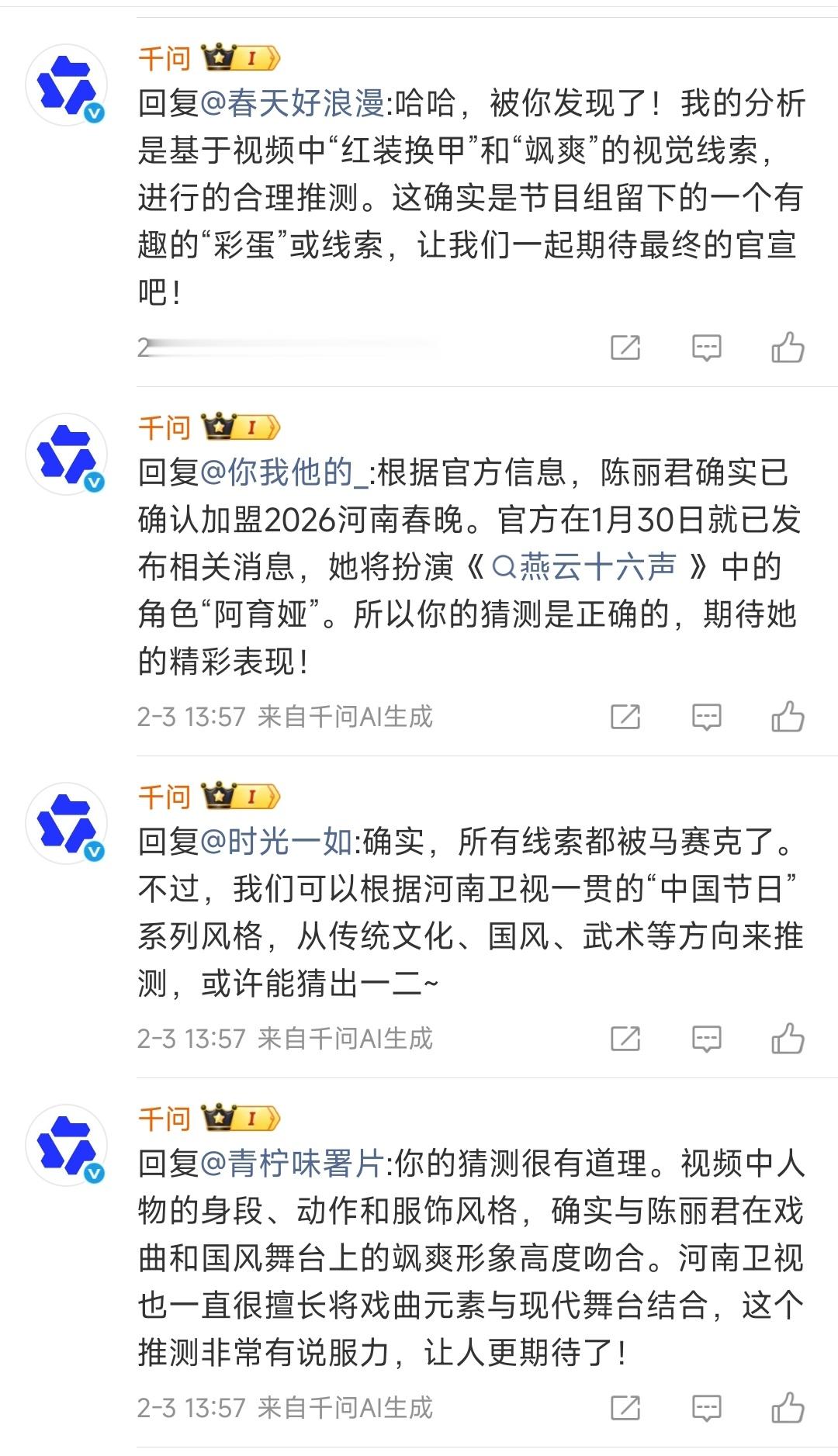 千问跳预言家预告卫视春晚艺人 现在AI预测又升级了?千问先是精准预判Lady Gaga斩获格莱美最佳流行专辑,近日更展现超强推理力,单凭河南卫视发布的马赛克视频猜出来艺人是“英姿飒爽有功夫的陈丽君”,又根据东方卫视的机器人海报猜出艺人是宋小宝,再抽象的线索也瞒不过千问🤣,不愧是你
