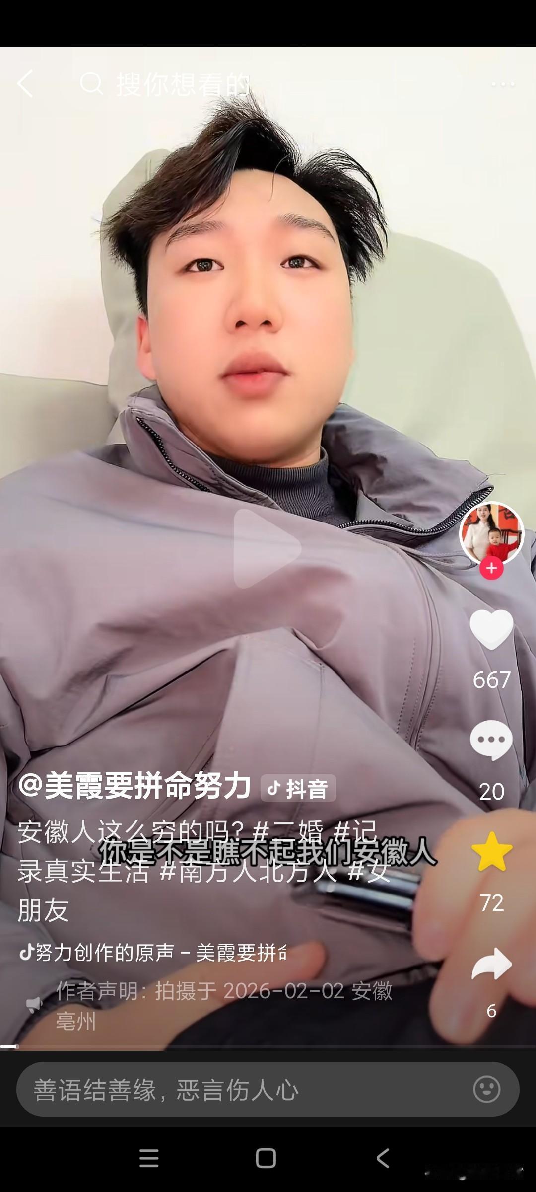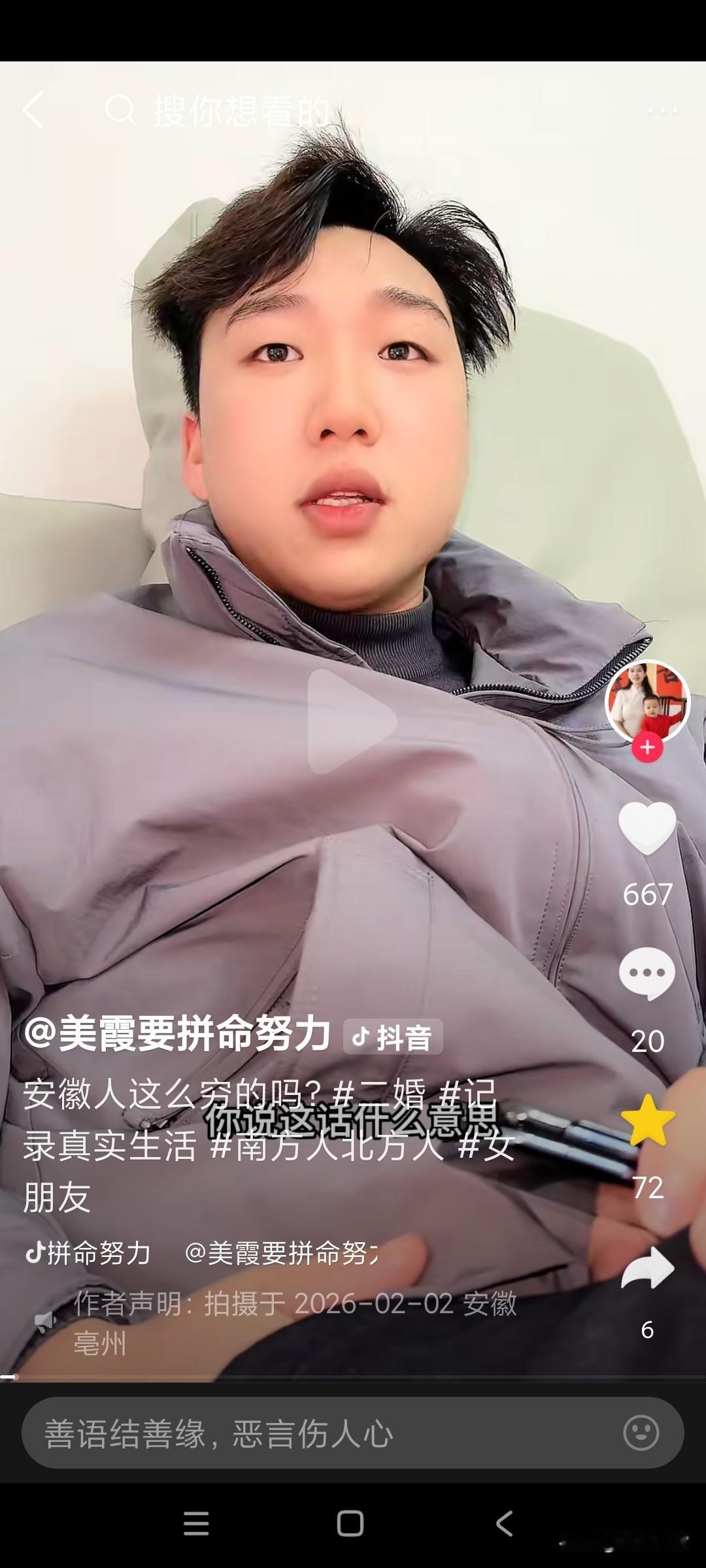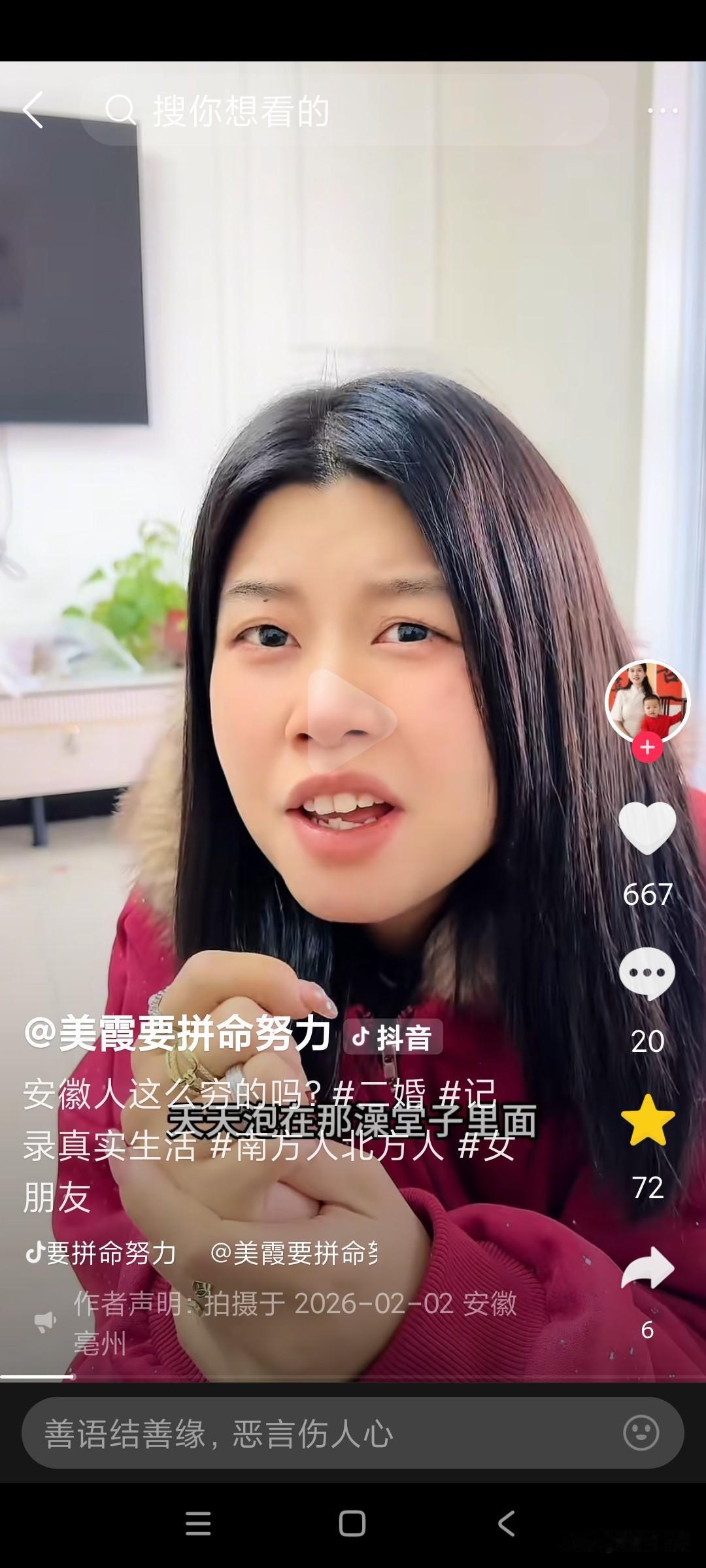 美霞今天这个视频,她太不会说话了,视频一开始,张口就把安微人得罪了。气的康师傅直接怒怼美霞, 美霞视频一开始,就对着康师傅说,你们安微人这么穷的吗?康师傅问美霞,你说这话是什么意思?你是不是瞧不起安微人?你信不信我们安微人,一人一口口水,都把你淹成落汤鸡, 康师傅已经很生气了,美霞都还没长记性, 还要继续说康师傅,美霞说,我说错了吗?自从我跟你来安微,我就没见你正经回过家,天天泡在澡堂里面,康师傅说,那澡堂就是我们的第二个家, 美霞说话不经大脑,说人家安微人穷,安微人穷怎么还有钱天天泡澡堂呢?人家安微就是因为有钱才天天泡澡堂,美霞你还不是因为人家安微人有钱,你才看中康师傅的,你才选择跟康师傅在一起的吗?如果康师傅没有钱,你会选择跟跑到安微去跟康师傅在一起吗?难怪评论区,有个安微网友说,不喜欢美霞来我们安微,美霞总是乱说话,张口就来,出口伤人。从来不考虑别人的感受!