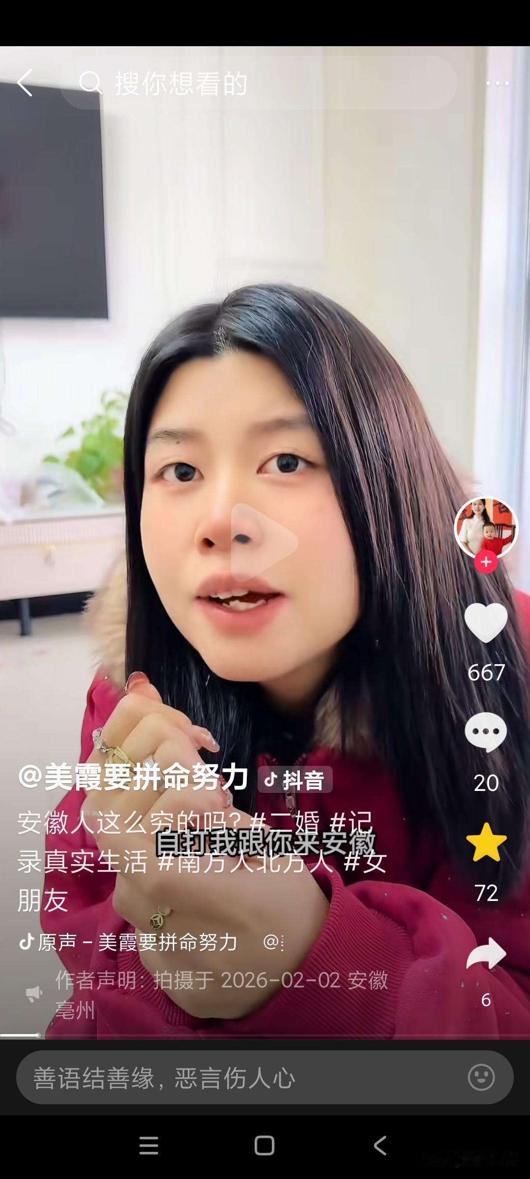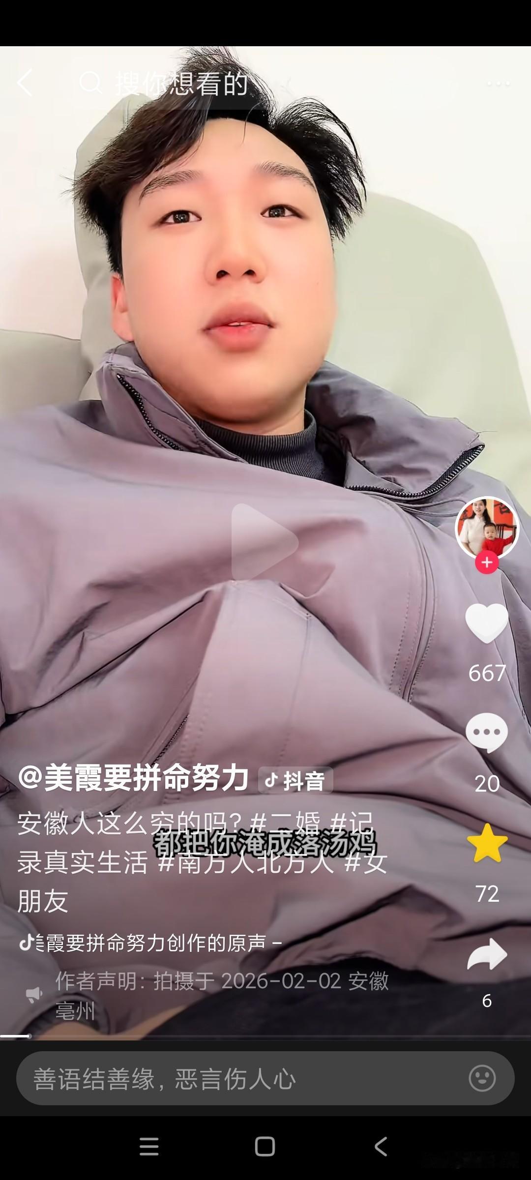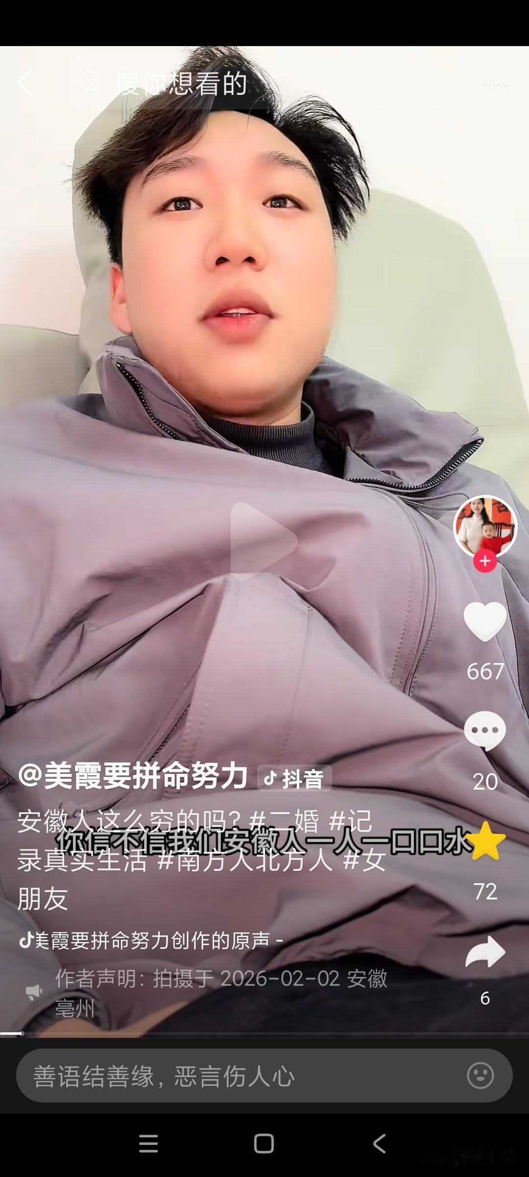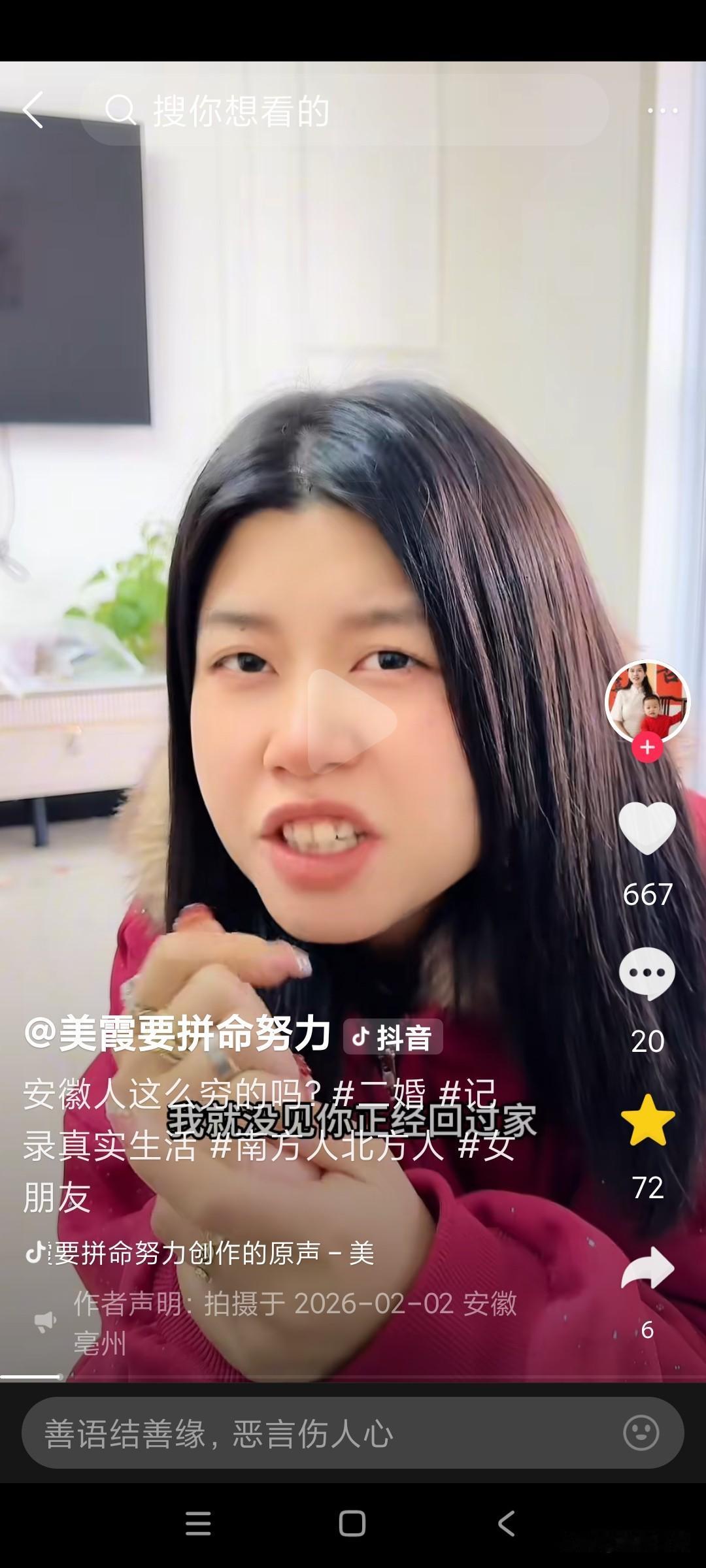 美霞今天这个视频,她太不会说话了,视频一开始,张口就把安微人得罪了。气的康师傅直接怒怼美霞, 美霞视频一开始,就对着康师傅说,你们安微人这么穷的吗?康师傅问美霞,你说这话是什么意思?你是不是瞧不起安微人?你信不信我们安微人,一人一口口水,都把你淹成落汤鸡, 康师傅已经很生气了,美霞都还没长记性, 还要继续说康师傅,美霞说,我说错了吗?自从我跟你来安微,我就没见你正经回过家,天天泡在澡堂里面,康师傅说,那澡堂就是我们的第二个家, 美霞说话不经大脑,说人家安微人穷,安微人穷怎么还有钱天天泡澡堂呢?人家安微就是因为有钱才天天泡澡堂,美霞你还不是因为人家安微人有钱,你才看中康师傅的,你才选择跟康师傅在一起的吗?如果康师傅没有钱,你会选择跟跑到安微去跟康师傅在一起吗?难怪评论区,有个安微网友说,不喜欢美霞来我们安微,美霞总是乱说话,张口就来,出口伤人。从来不考虑别人的感受!