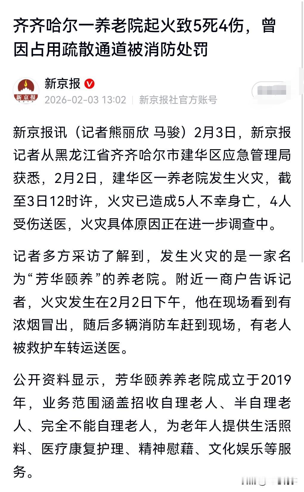 这养老院问题很大呀,曾因占用疏散通道被处罚。 没想到这次起火了导致了5死4伤的惨烈后果。 这真是太悲剧了,本来是去养老的,结果把命给丢在那里了。 一定要让这养老院做出重要赔偿才行,而且还要追究责任。 该坐牢的坐牢。