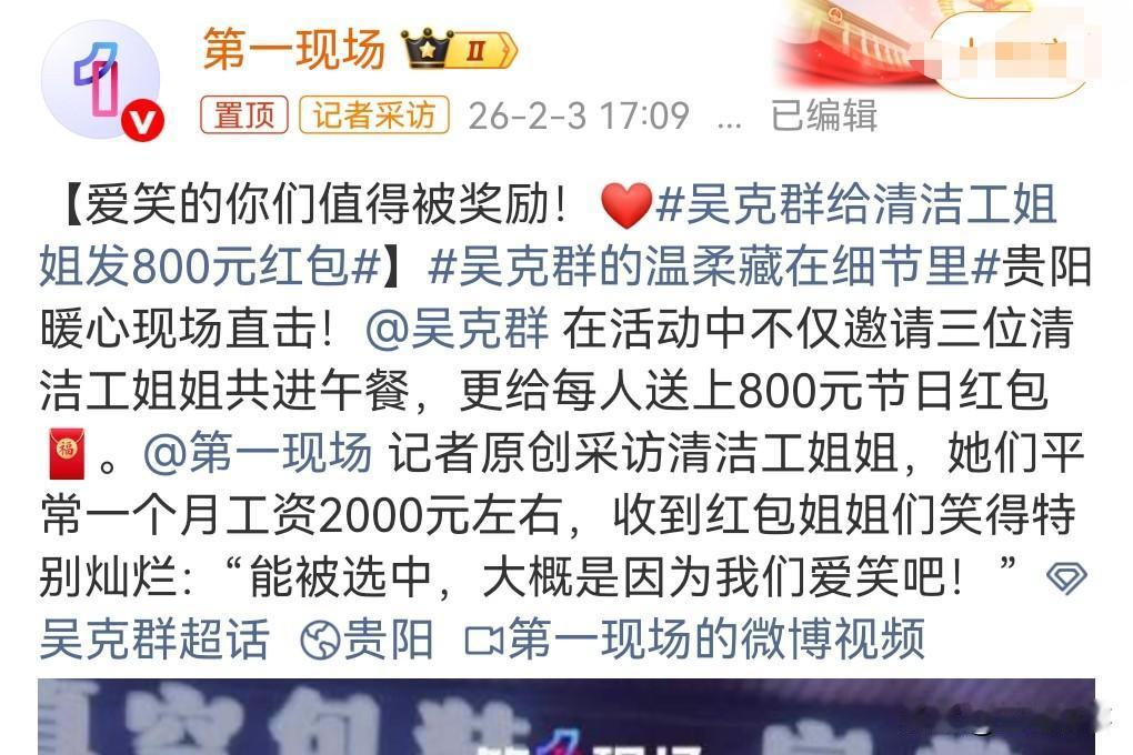 吴克群真的是个特别好的明星啊,经常看到他做好事的消息。 人品真的是可以呀。 2月3日热搜,吴克群给清洁工大姐发800元红包。 800块,不少了。虽然明星很有钱,但是这些清洁工一个月才一两千块钱,能够一下发800块红包,对她们来说已经很多了。 还邀请她们一起吃饭。