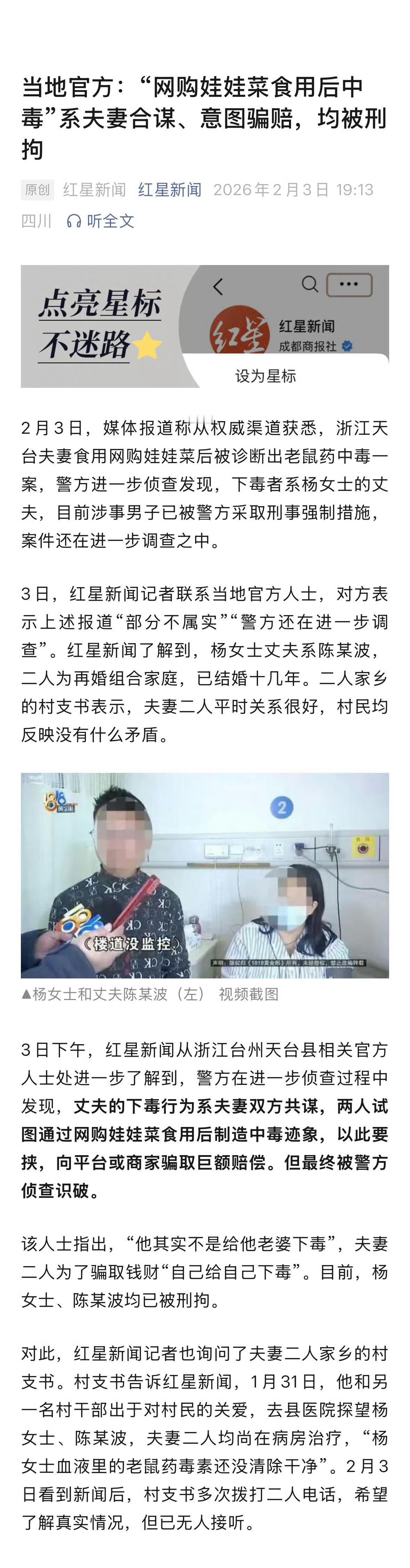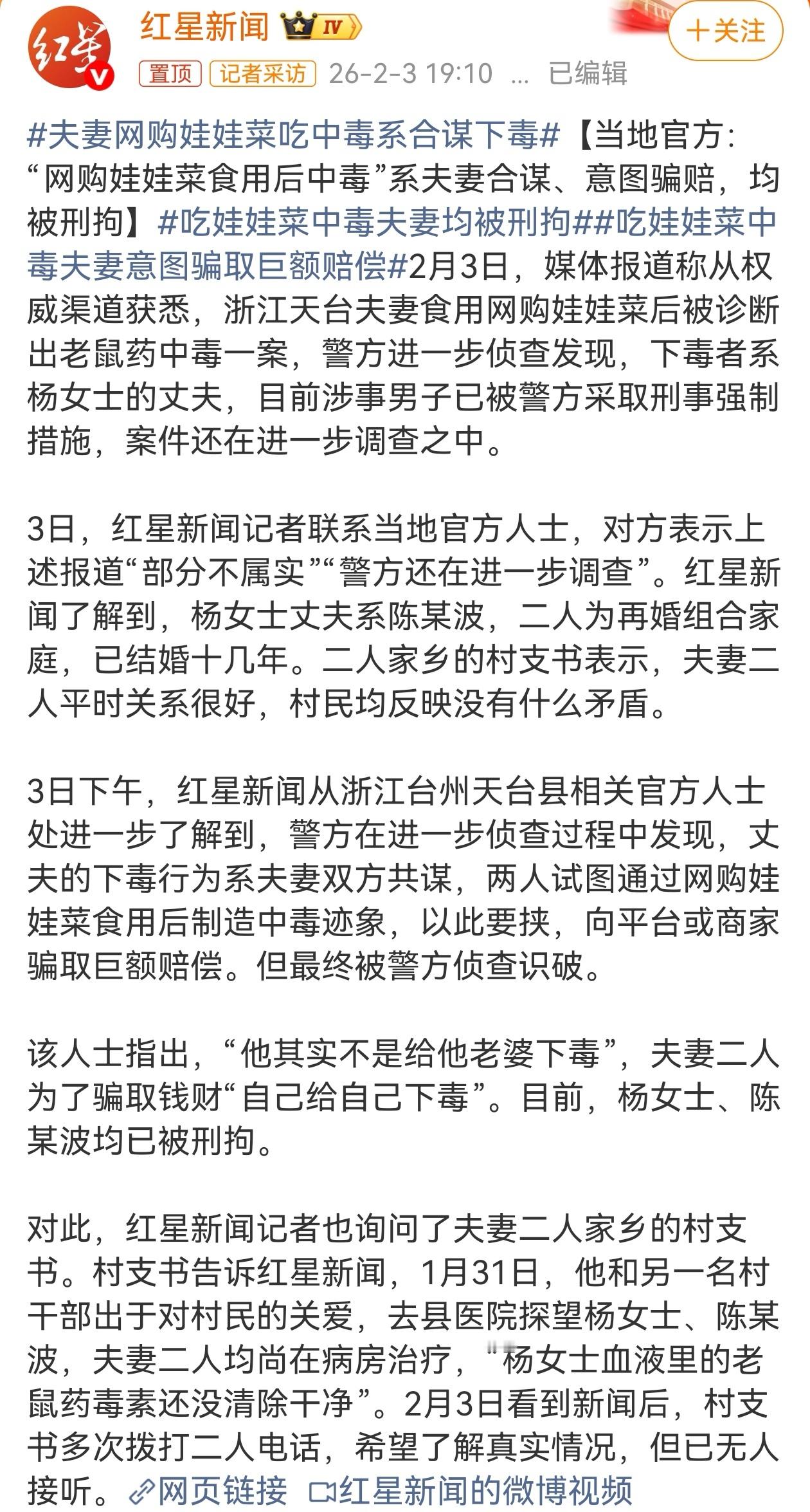 此前,相关调查结果还没出来前,多家媒体曾密集报道“夫妻网购娃娃菜”中毒事件,通过春秋笔法刻意渲染相关舆情,给电商平台、商家造成巨大舆论压力,更导致该事件反转后再反转,事实却是,夫妻二人合谋“剧本”,丈夫下毒后,妻子“以身入局”中毒住院,为的是骗取平台、商家的赔偿。吃娃娃菜中毒夫妻均被刑拘夫妻网购娃娃菜吃中毒系合谋下毒